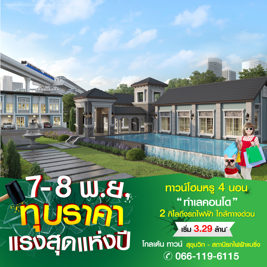 Promotion : 7-8 พ.ย. นี้ ทุบราคา แรงสุดแห่งปี ทาวน์โฮมหรู สไตล์อังกฤษ ทำเลคอนโด 2 กิโลถึงรถไฟฟ้า ใกล้ทางด่วน ขนาด 4 ห้องนอน 2 ที่จอดรถ ฟังก์ชันครบครัน พร้อมสโมสรสุดอลังการ ตอบโจทย์ทุกไลฟ์สไตล์ ในราคาเริ่ม 3.29 ล้าน*