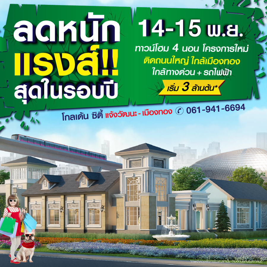 Promotion : 14 - 15 พ.ย. นี้ ลดหนัก แรงส์!!! สุดในรอบปี คุ้มกว่านี้ไม่มีอีกแล้ว ทาวน์โฮมหรู 4 ห้องนอน โครงการใหม่ สไตล์อังกฤษ ติดถนนใหญ่ ใกล้เมืองทอง + ทางด่วน + รถไฟฟ้า เริ่ม 3 ล้านต้น*