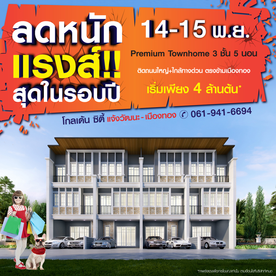 Promotion : 14 - 15 พ.ย. นี้ ลดหนัก แรงส์!!! สุดในรอบปี คุ้มกว่านี้ไม่มีอีกแล้ว Premium Townhome 3 ชั้น 5 ห้องนอน พร้อมฟังก์ชันการใช้งานแบบครบครัน คลับเฮ้าส์หรู และสวนสวยรอบโครงการ ทำเลศักยภาพ ติดถนนใหญ่ ใกล้ทางด่วน ตรงข้ามเมืองทอง เริ่ม 4 ล้านต้น*
