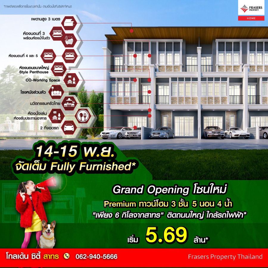 Promotion : 4-15 พ.ย. นี้ Grand Opening โซนใหม่ จัดเต็ม Fully Furnished รีบเล้ย Premium ทาวน์โฮม 3 ชั้น 5 ห้องนอน 4 ห้องน้ำฟังก์ชั่นครบครัน ตอบโจทย์ทุกการใช้ชีวิต ทำเลใกล้เมือง " เพียง 6 กิโลจากสาทร " ติดถนนใหญ่ ใกล้รถไฟฟ้า เริ่ม 5.69 ล้าน*