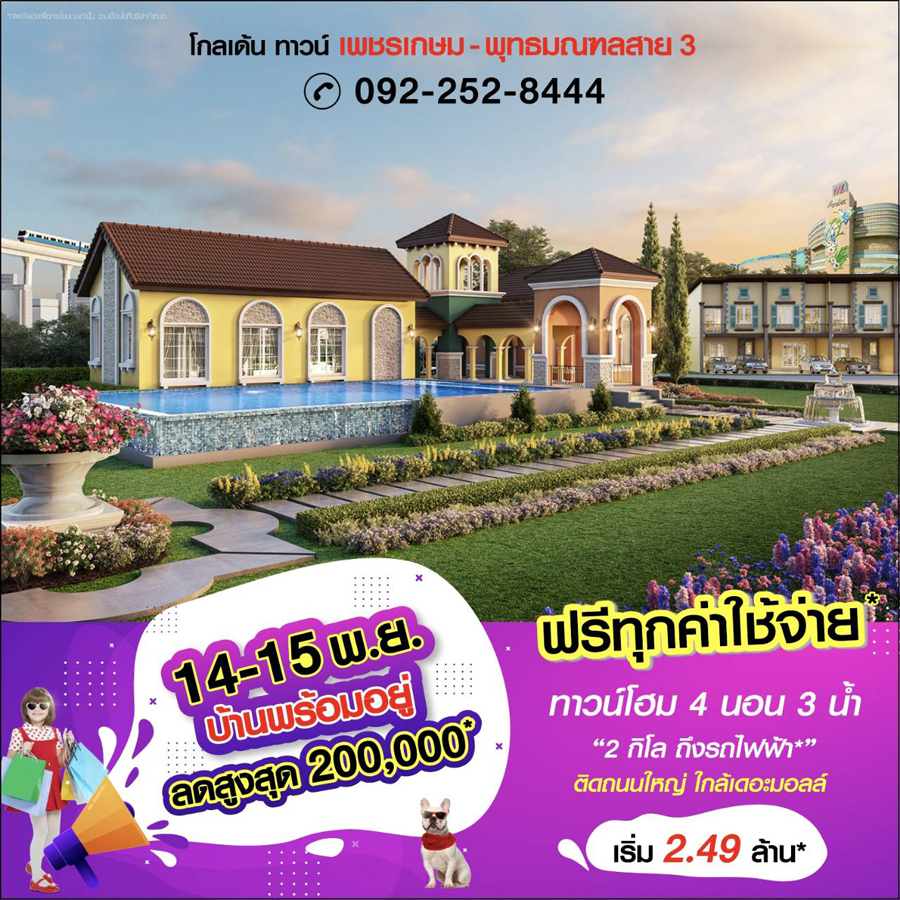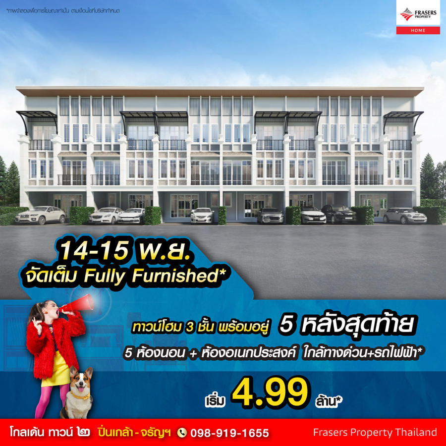 Promotion : 14-15 พ.ย. นี้ ผ่อน 9,999 บาท*/เดือน เปิดจองบ้านรุ่นขายดี ล็อตใหม่ โซนหน้าโครงการ รีบเล้ย ทาวน์โฮม 4 ห้องนอน 3 ห้องน้ำ พร้อมห้องพระ + โรงหนังส่วนตัว* อลังการสโมสรสไตล์อังกฤษ บนทำเลศักยภาพ ใกล้ห้างฯ + ทางด่วน + รถไฟฟ้า* เริ่ม 2.65 ล้าน*