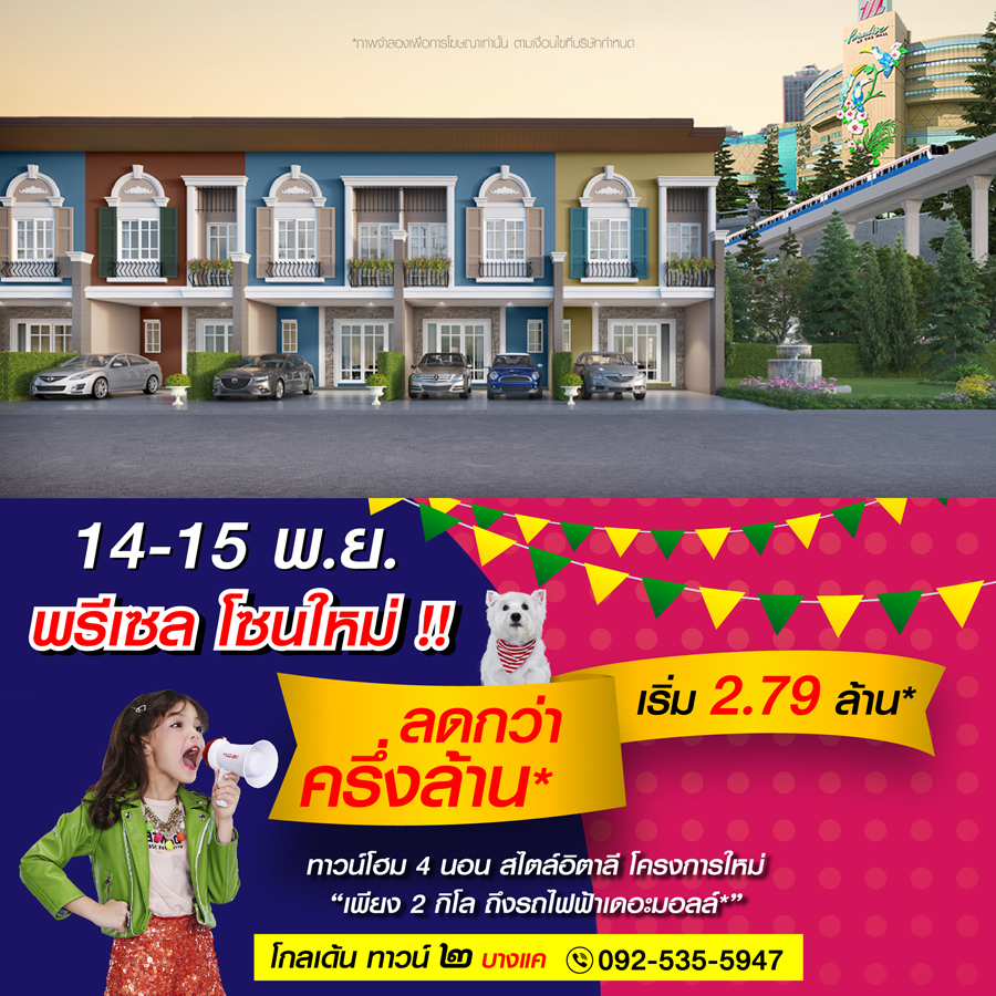 Promotion : 14 - 15 พ.ย. นี้ Pre Sale โซนใหม่!! จัดหนักจัดแรงกว่าเดิม!! ลดแล้ว ลดอีก!! ลดแรงกว่า ครึ่งล้าน* กับราคาสุดคุ้ม! เริ่ม 2.79 ล้าน* พลาดไม่ได้แล้ว คุ้มสุดในย่านบางแค ทาวน์โฮม 4 ห้องนอน สไตล์อิตาลี โครงการใหม่ ทำเลศักยภาพ เพียง 2 กิโล ถึงรถไฟฟ้าเดอะมอลล์* สโมสรอลังการ ตอบโจทย์ทุกไลฟ์สไตล์