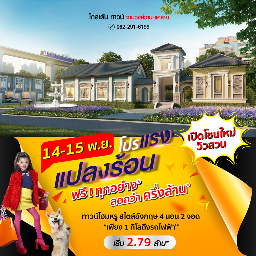 Promotion : 14-15 พ.ย. นี้ โปรแรง แปลงร้อน โปรพิเศษ ฟรี! ทุกอย่าง* ลดสูงสุดกว่า ครึ่งล้าน* พิเศษ เปิดโซนใหม่วิวสวน รีบเลย ทาวน์โฮม 4 ห้องนอน 2 ที่จอดรถ สไตล์อังกฤษ พร้อมฟังก์ชัน ห้องพระ + ครัวไทย* ใกล้เดอะมอลล์ " เพียง 1 กิโล ถึงรถไฟฟ้า " เริ่ม 2.79 ล้าน*