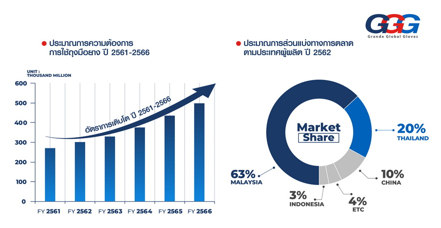 "จากข้อมูลขององค์การอนามัยโลก (WHO) ในช่วงปี 2553-2562 ความต้องการใช้ถุงมือยางของโลก มีอัตราเติบโตเฉลี่ย 8% ต่อปี โดยมีปัจจัยหนุนทั้งการขยายตัวของประชากรโลก ซึ่งมีการใช้ถุงมือยางทั้งในภาคอุตสาหกรรมและสาธารณสุข ในปี 2563 การแพร่ระบาดของโควิด-19 ส่งผลให้ความต้องการใช้ถุงมือยางของโลกพุ่งขึ้นสูงมาก เพื่อตอบโจทย์การใช้งานภายใต้วิถีชีวิตใหม่ ความต้องการใช้ถุงมือยางของโลกในปี 2563 จะมากกว่า 330,000 ล้านชิ้นต่อปี และคาดการณ์ว่าปี 2564 จนถึงปี 2566 จะเติบโตไปถึง 500,000 ล้านชิ้นต่อปี เป็นผลมาจากปัจจัยหลัก ได้แก่ การเติบโตของอุตสาหกรรมทางการแพทย์ และการเติบโตของผู้บริโภคทั่วโลกที่ให้ความสำคัญด้านสุขอนามัยอย่างมากในปัจจุบัน สะท้อนโอกาสของผู้ผลิตถุงมือยางในการเร่งส่งออกไปยังตลาดโลก"