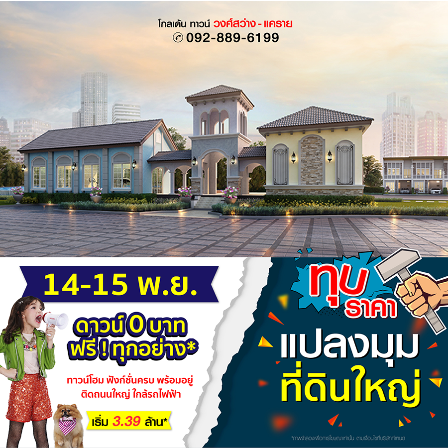 โกลเด้น ทาวน์ วงศ์สว่าง-แคราย 14-15 พ.ย. นี้ โปรพิเศษ ดาวน์ 0 บาท ฟรี ! ทุกอย่าง* เริ่ม 3.39 ล้าน*