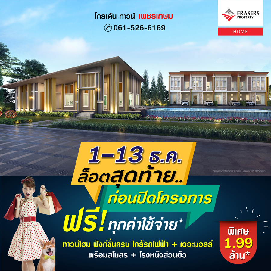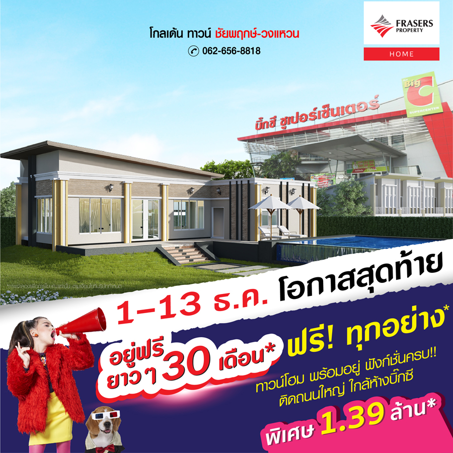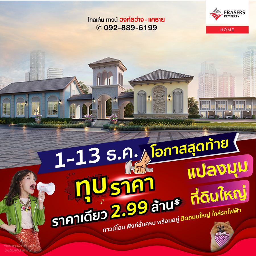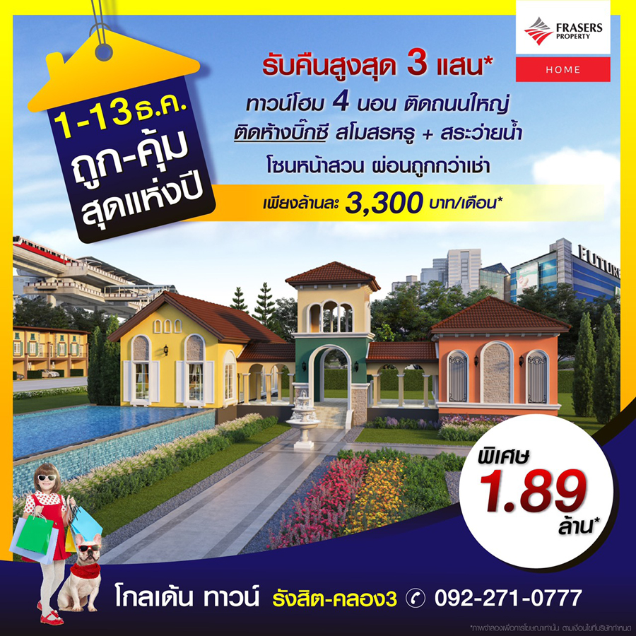 Promotion : 1-13 ธ.ค.นี้ ถูก-คุ้ม สุดแห่งปี รับคืนสูงสุด 3 แสน* เปิดโซนหน้าสวน พร้อมโปรแรง ผ่อนถูกกว่าเช่า ผ่อนเพียงล้านละ 3,300 บาท/เดือน* คุ้มยิ่งกว่าคุ้ม ราคาสุดพิเศษเพียง 1.89 ล้าน* ทาวน์โฮม 4 ห้องนอน ฟังก์ชันครบครัน พร้อมสโมสรหรู + สระว่ายน้ำ ทำเลคุณภาพ ติดถนนใหญ่+ห้างบิ๊กซี