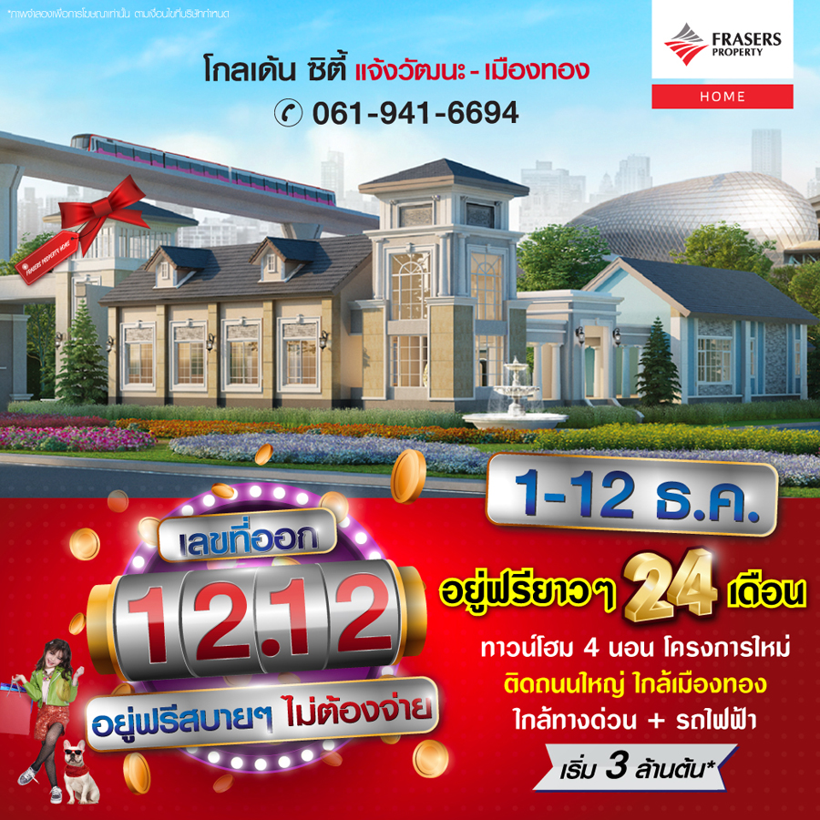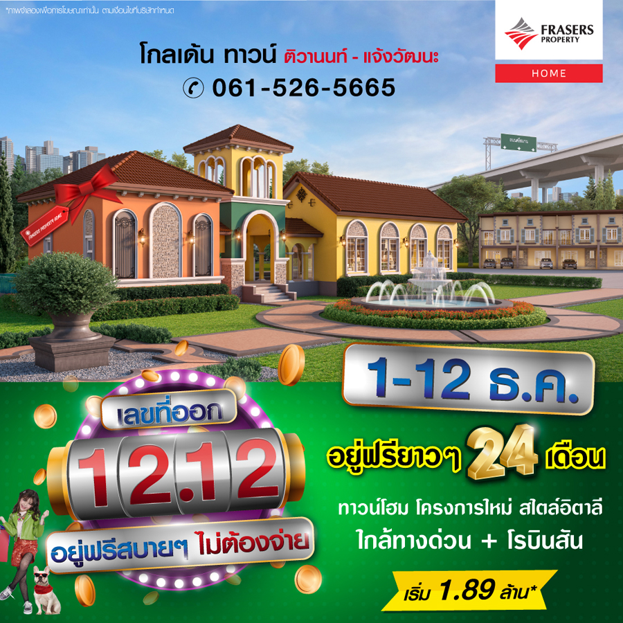Promotion : 11-12 ธ.ค. ซื้อบ้านตอนนี้ ให้อยู่ฟรียาวๆ นาน 24 เดือน* ทาวน์โฮมหรู 4 นอน โครงการใหม่ สไตล์อังกฤษติดถนนใหญ่ ใกล้เมืองทอง + ทางด่วน + รถไฟฟ้า เริ่ม 3 ล้านต้น*