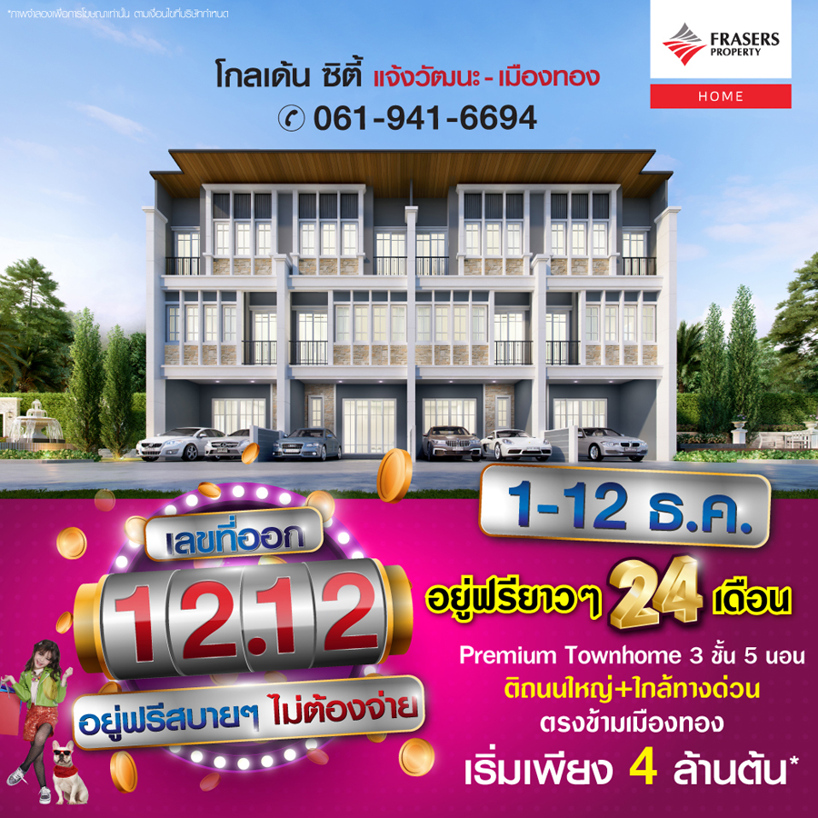 Promotion : 1-12 ธ.ค. ซื้อบ้านตอนนี้ ให้อยู่ฟรียาวๆ นาน 24 เดือน* Premium Townhome 3 ชั้น 5 นอน พร้อมฟังก์ชันการใช้งานแบบครบครัน คลับเฮาส์หรู และสวนสวยรอบโครงการ ทำเลศักยภาพ ติดถนนใหญ่ ใกล้ทางด่วน ตรงข้ามเมืองทอง เริ่ม 4 ล้านต้น*