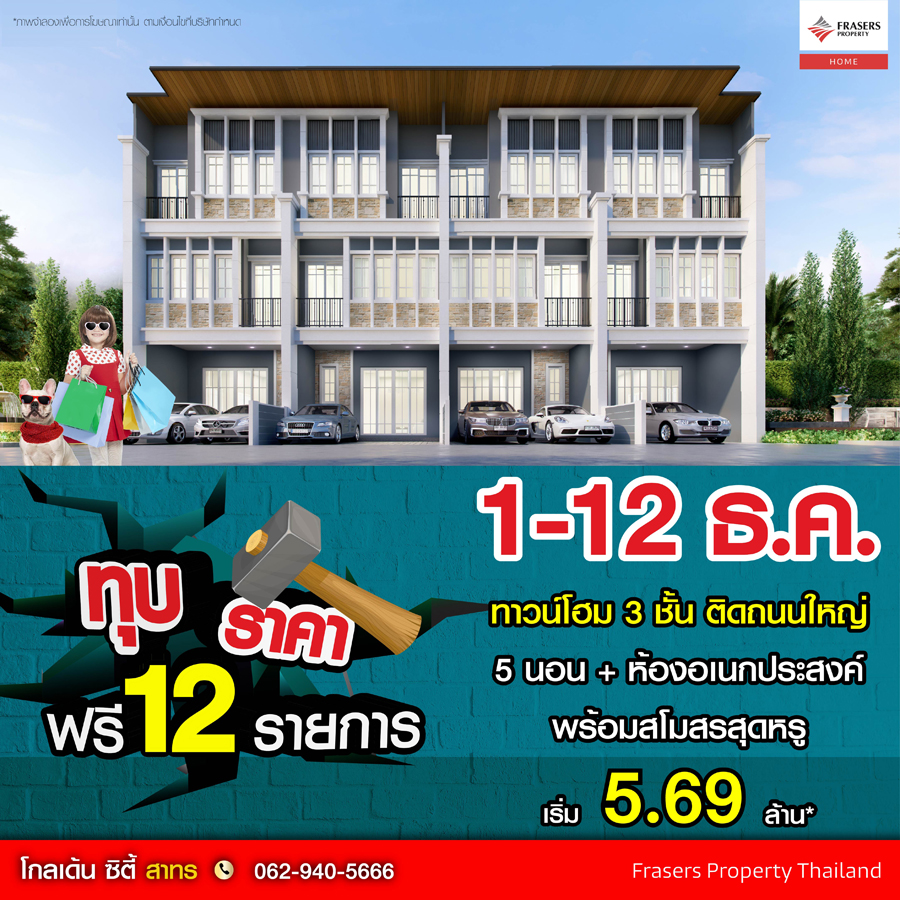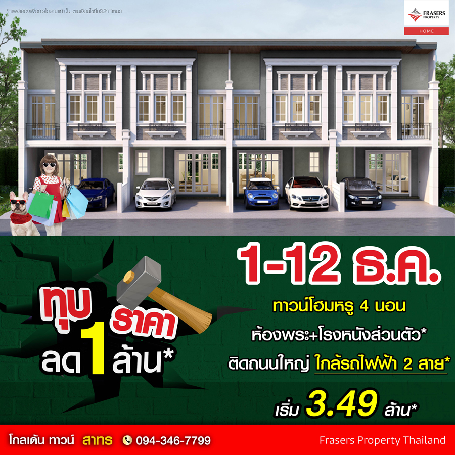 Promotion : 1-12 ธ.ค. นี้ ทุบราคา ลด 1 ล้าน* Premium ทาวน์โฮม 4 ห้องนอน 2 ที่จอดรถ ฟังก์ชันครบครัน ห้องพระ + ครัวไทย* พร้อมคลับเฮาส์หรู สไตล์อังกฤษ ติดถนนใหญ่ ใกล้รถไฟฟ้า "เพียง 5 สถานีถึงสาทร" เริ่ม 3.49 ล้าน*
