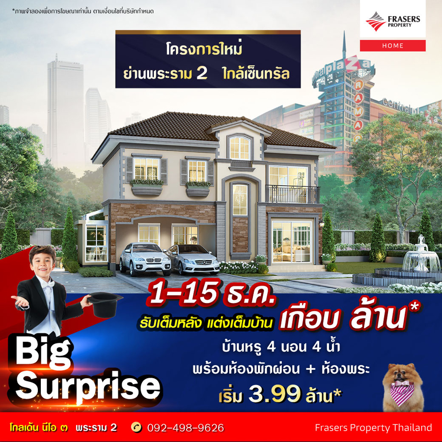 Promotion : 1-15 ธ.ค. นี้ Big Surprise โปรสุดปัง รับเต็มหลัง แต่งเต็มบ้าน เกือบ ล้าน* โครงการใหม่ ย่านพระรามสอง บ้านหรู หลังใหญ่... สไตล์อิตาลี ฟังก์ชันครบ 4 ห้องนอน 4 ห้องน้ำ พร้อมห้องพักผ่อน + ห้องพระ ทำเลสุดฮอต ติดถนนใหญ่ ใกล้เซ็นทรัล+ทางด่วน เริ่มเพียง 3.99 ลบ.*