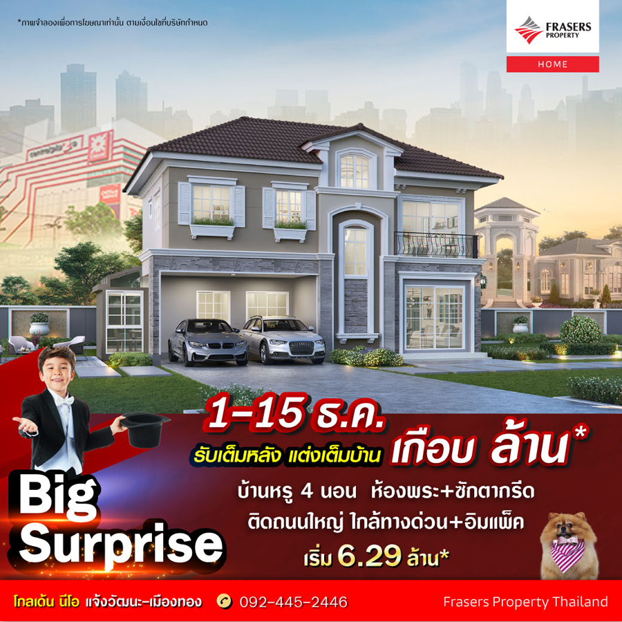 Promotion : Big Surprise 1-15 ธ.ค. นี้ รับเต็มหลัง แต่งเต็มบ้าน ลดสูงสุด เกือบ ล้าน* บ้านหรู 4 ห้องนอน 4 ห้องน้ำพร้อมห้องพระ + ซักตากรีด สุดยอดทำเลทอง ติดถนนใหญ่ ใกล้ทางด่วน+อิมแพ็ค เริ่ม 6.29 ล้าน*