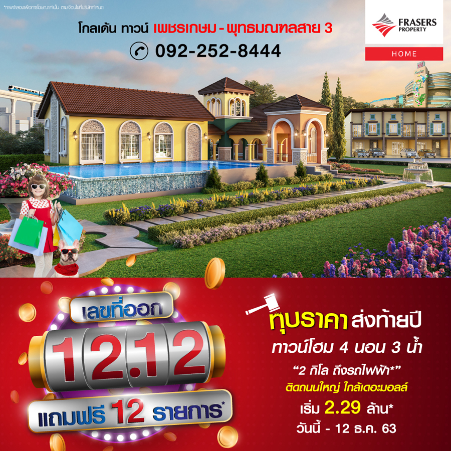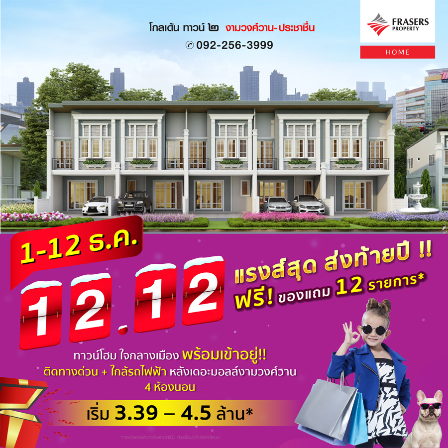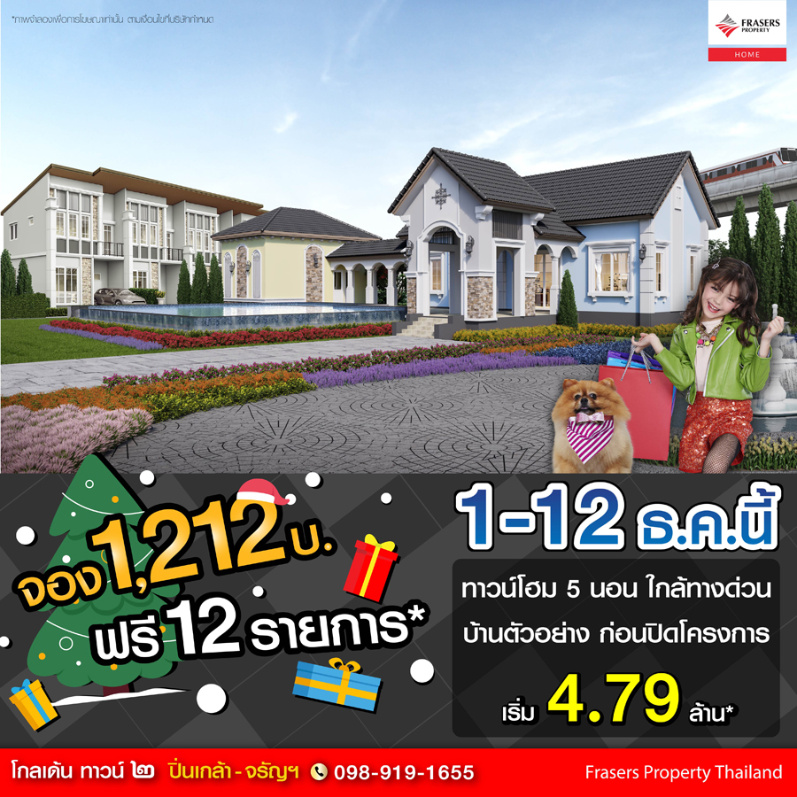 Promotion : 1-12 ธ.ค. นี้ จอง 1,212 บาท ฟรี 12 รายการ* ทาวน์โฮม 4 ห้องนอน 3 ห้องน้ำ พร้อมห้องพระ + โรงหนังส่วนตัว* อลังการสโมสรสไตล์อังกฤษ บนทำเลศักยภาพ ใกล้ห้างฯ + ทางด่วน + รถไฟฟ้า* เริ่ม 2.65 ล้าน*