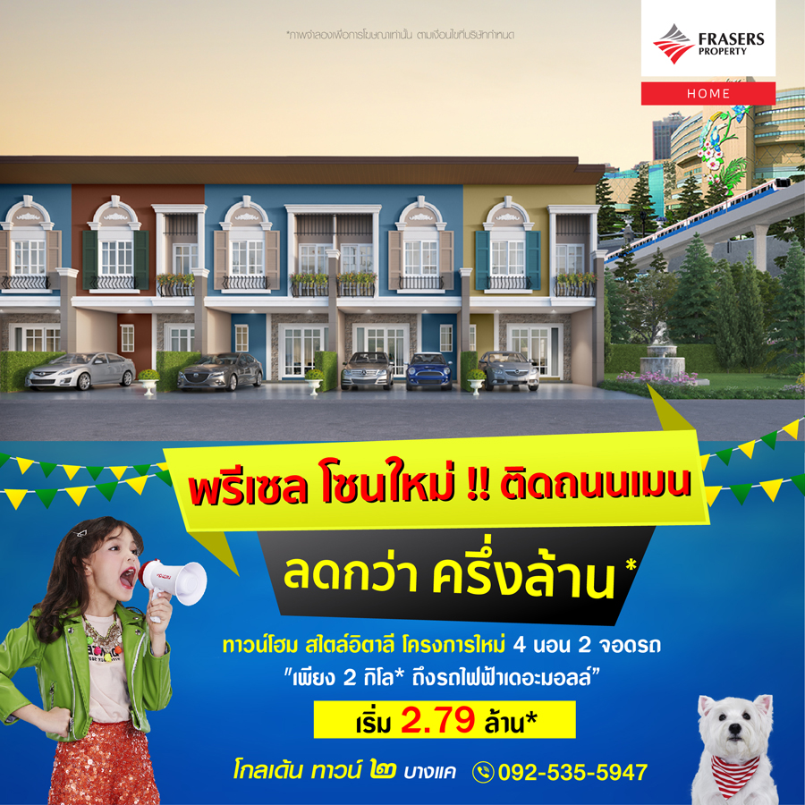 Promotion : 24 พ.ย.- 31 ธ.ค. นี้ Pre Sale โซนใหม่!! จัดหนักจัดแรงกว่าเดิม!! ลดแล้ว ลดอีก!! ลดแรงกว่า ครึ่งล้าน* กับราคาสุดคุ้ม! เริ่ม 2.79 ล้าน* พลาดไม่ได้แล้วคร๊าบ คุ้มสุดในย่านบางแค ทาวน์โฮม 4 ห้องนอน สไตล์อิตาลี โครงการใหม่ ทำเลศักยภาพ เพียง 2 กิโล ถึงรถไฟฟ้าเดอะมอลล์* สโมสรอลังการ ตอบโจทย์ทุกไลฟ์สไตล์