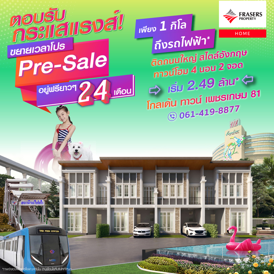 Promotion : 30 พ.ย.- 15 ธ.ค. นี้ ตอบรับกระแสสุดแรง ขยายเวลาโปรฯ "Pre-Sale" ซื้อตอนนี้ ให้อยู่ฟรียาวๆ นาน 24 เดือน* เริ่ม 2.49 ล้าน* หรูหรา สไตล์อังกฤษ ติดถนนใหญ่ ทาวน์โฮม 4 ห้องนอน 2 ที่จอดรถ เพียง 1 กิโล* ถึงรถไฟฟ้า