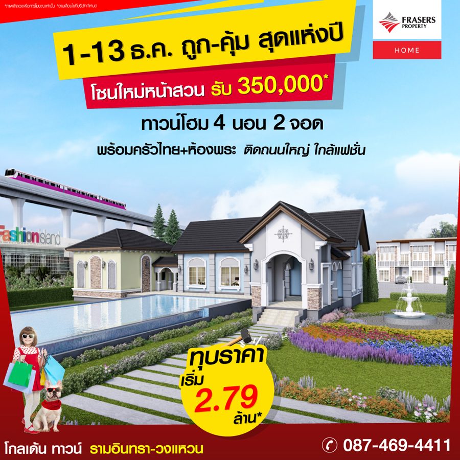 Promotion : 1-13 ธ.ค.นี้ ถูก! - คุ้ม! ที่สุดแห่งปี เปิดโซนใหม่หน้าสวน รับ 350,000* ทาวน์โฮมหรู 4 ห้องนอน 2 ที่จอดรถ ย่านรามอินทรา ฟังก์ชันครบครัน พร้อมครัวไทย+ห้องพระ อลังการสโมสร สไตล์อังกฤษ สุดยอดทำเล หลังแฟชั่นฯ ติดถนนใหญ่ พิเศษเพียง 2.79 ล้าน*