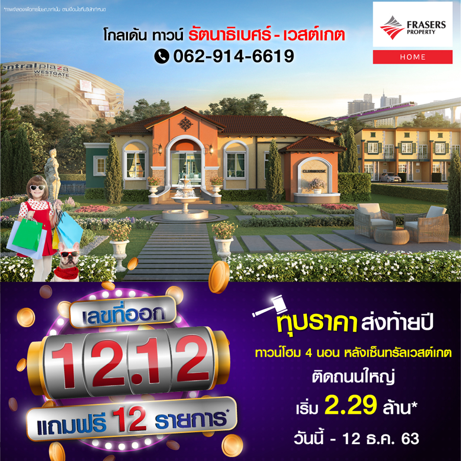 Promotion : วันนี้ - 12 ธ.ค. 63 ทุบราคาส่งท้ายปี มาพร้อมของแถมฟรีถึง 12 รายการ* ทาวน์โฮม 4 ห้องนอน พร้อมอยู่ คุ้มสุด!! กับฟังก์ชัน ครัวไทย + ห้องพระ พร้อมสโมสรส่วนตัว ท่ามกลางธรรมชาติร่มรื่น พิเศษบนทำเลทอง ติดถนนใหญ่ + หลังเซนทรัลเวสต์เกต เริ่ม 2.29 ล้าน*