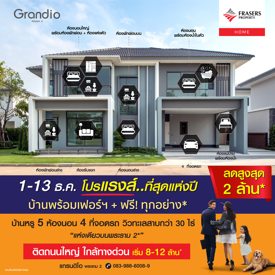 Promotion : 1-13 ธ.ค. นี้ โปรแรงส์...ที่สุดแห่งปี บ้านพร้อมเฟอร์ฯ + ฟรี!!! ทุกอย่าง* พร้อมส่วนลดสูงสุด 2 ล้าน* บ้านเดี่ยวสุดหรู 5 ห้องนอน 4 ที่จอดรถ พร้อม Double Living room ส่วนกลางสุดอลังการ วิวทะเลสาบกว่า 30 ไร่ คุ้มสุด! บนทำเลทอง ย่านพระราม 2 ติดถนนใหญ่ ใกล้ทางด่วน เริ่ม 8 - 12 ล้าน*