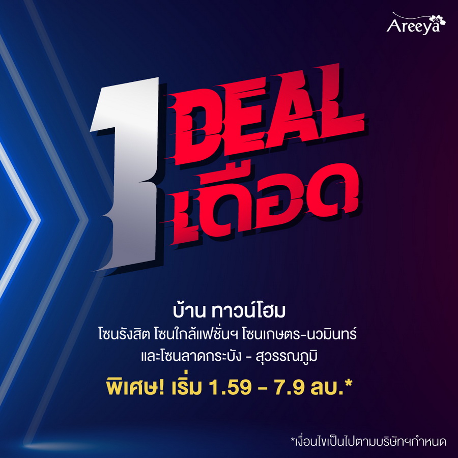 วันดีลเดือด ดีลดีๆ ที่รวมโครงการบ้านเดี่ยว และทาวน์โฮมพรีเมี่ยมจากอารียาฯ ที่ราคาดีสุดในย่าน* พร้อมพื้นที่พิเศษ Flexi Kitchen มุมปลูกต้นไม้ มุมพักผ่อนจิบชายามบ่าย มุมดริปกาแฟเท่ๆ ไปจนถึงพื้นที่ส่วนกลางสำหรับทุกคนในครอบครัว ตอบโจทย์ไลฟ์สไตล์ และความต้องการที่หลากหลายได้อย่างลงตัว พิเศษ! เริ่มต้น 1.59 ล้านบาท* จำนวนจำกัด