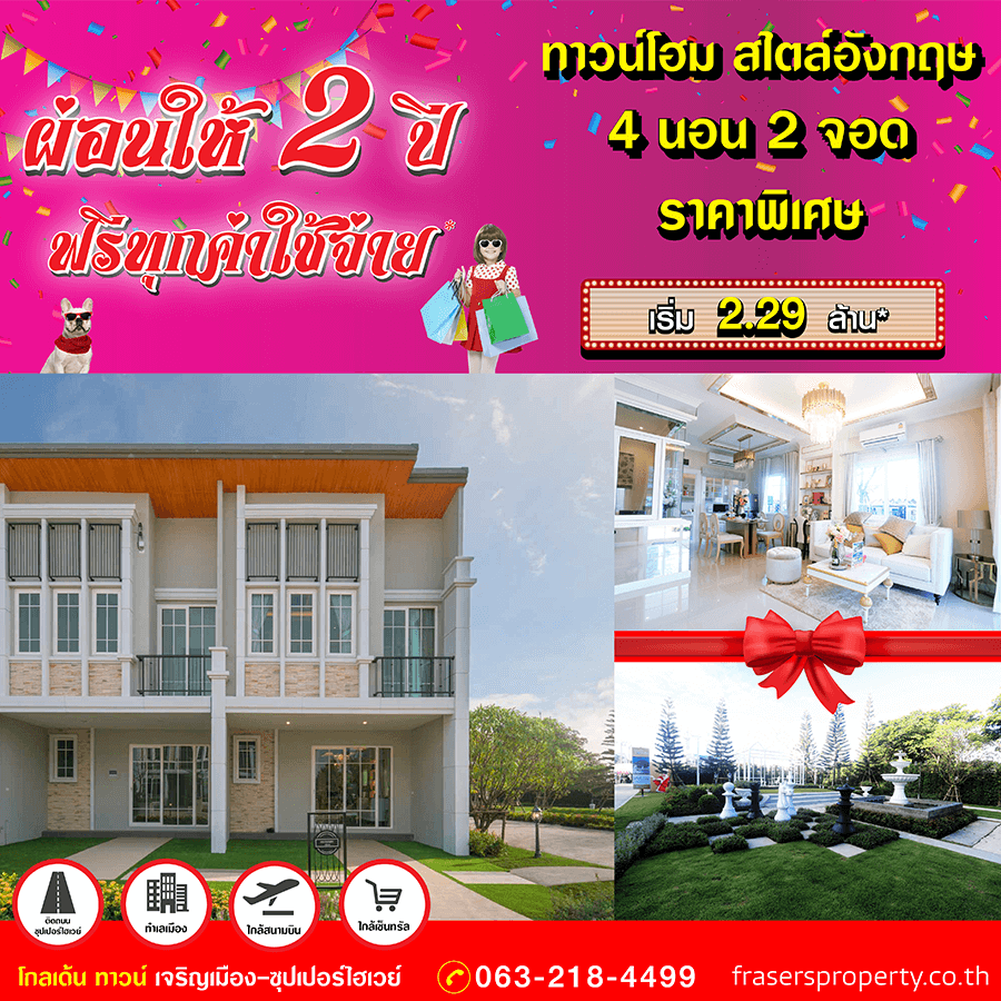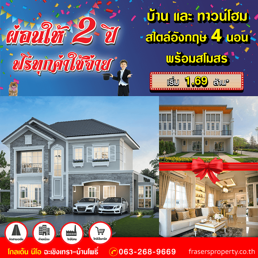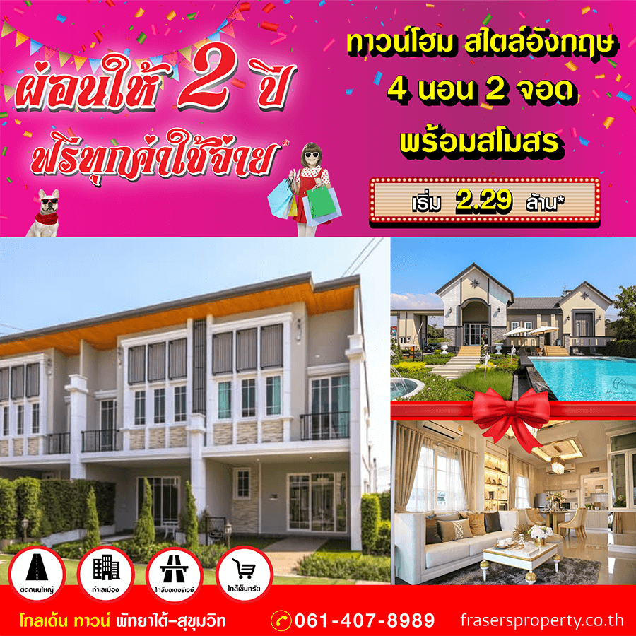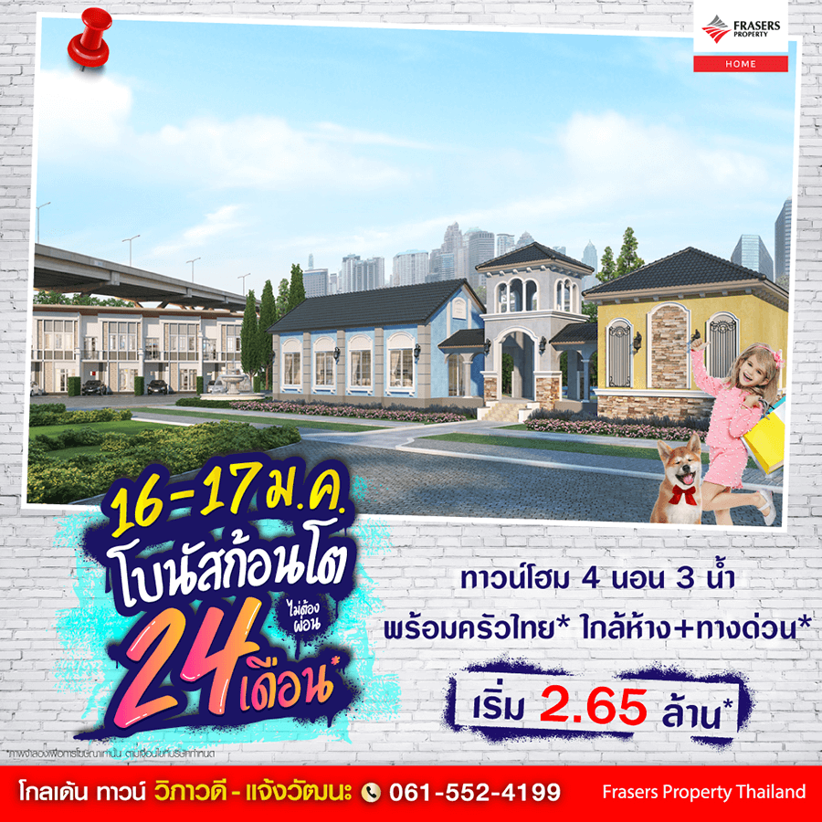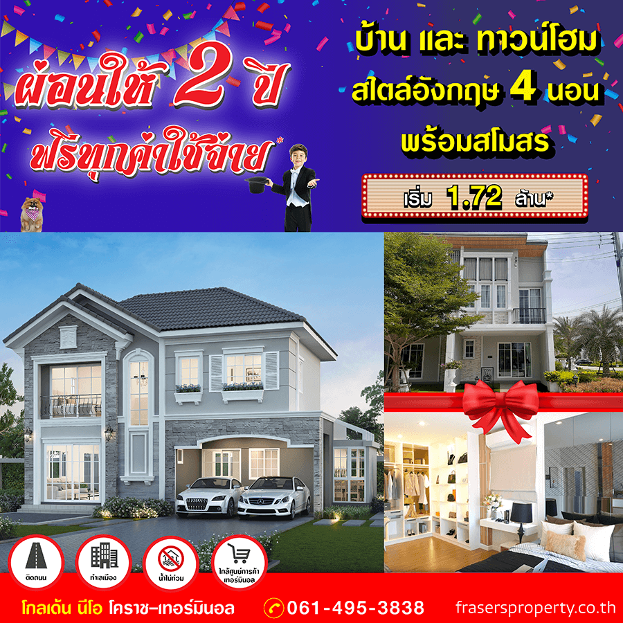 Promotion : 16-17 ม.ค. นี้ รับโบนัสก้อนโต ไม่ต้องผ่อนนาน 24 เดือน* ทาวน์โฮม 4 ห้องนอน 3 ห้องน้ำพร้อมห้องพระ + โรงหนังส่วนตัว*อลังการสโมสรสไตล์อังกฤษ บนทำเลศักยภาพ ใกล้ห้างฯ + ทางด่วน + รถไฟฟ้า* เริ่ม 2.65 ล้าน*