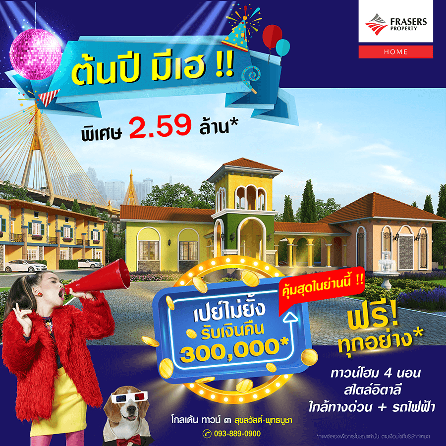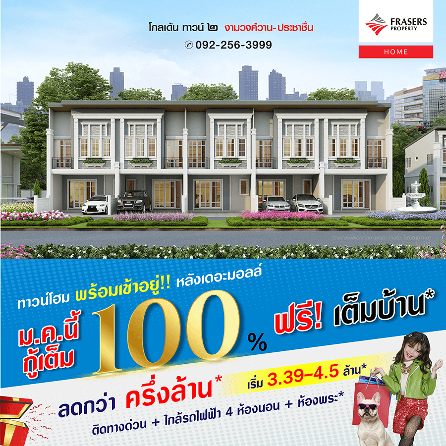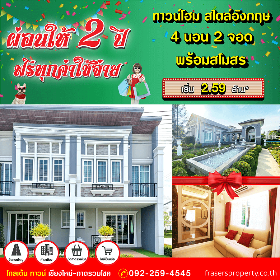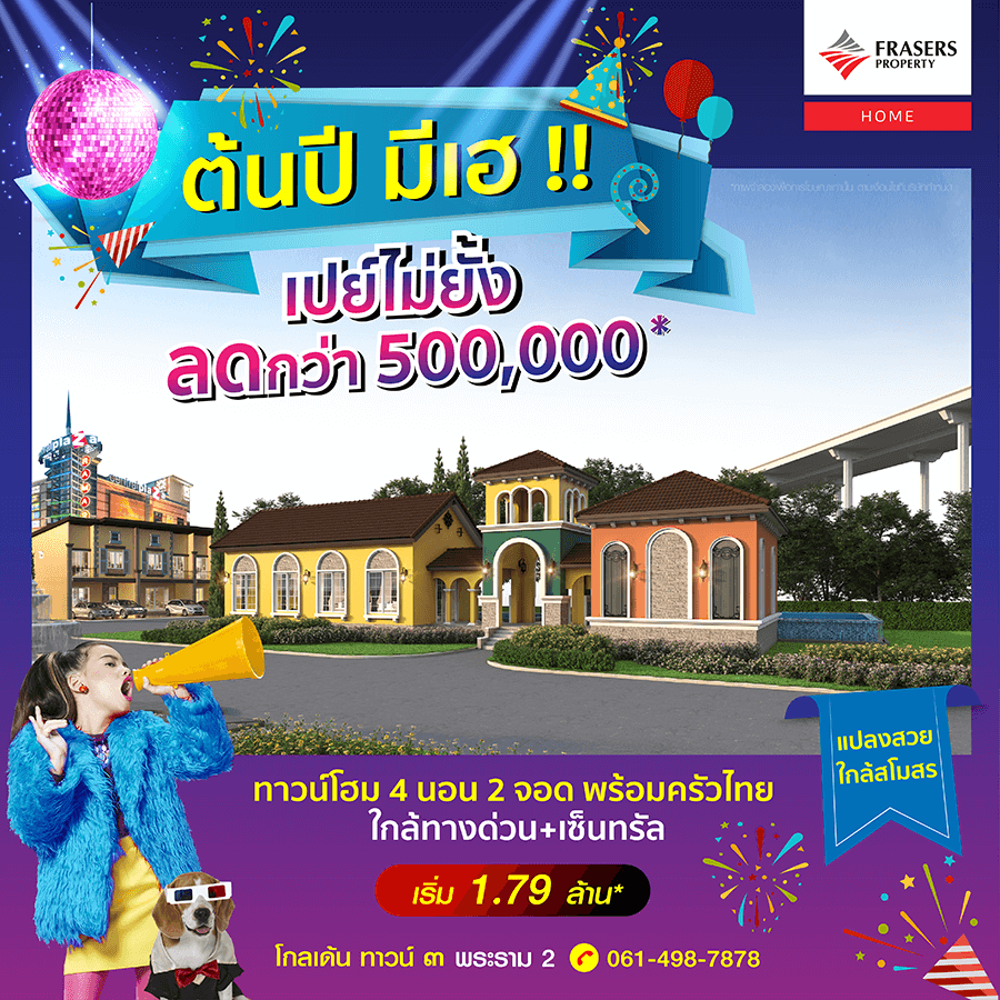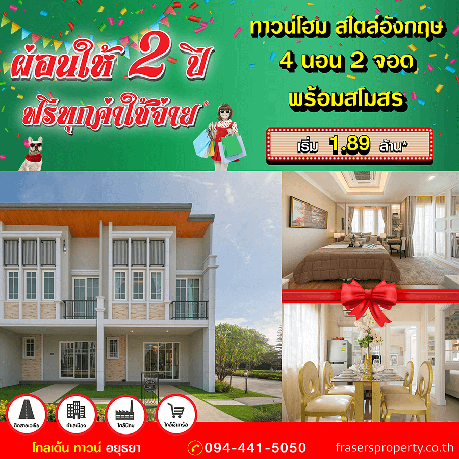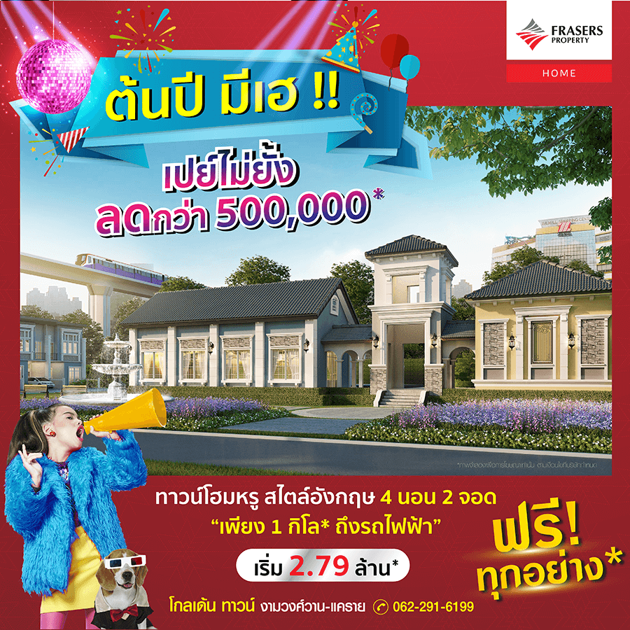 Promotion : 16-17 ม.ค. นี้ รับโบนัสก้อนโต ไม่ต้องผ่อนนาน 24 เดือน* ทาวน์โฮม 4 ห้องนอน 3 ห้องน้ำพร้อมห้องพระ + โรงหนังส่วนตัว*อลังการสโมสรสไตล์อังกฤษ บนทำเลศักยภาพ ใกล้ห้างฯ + ทางด่วน + รถไฟฟ้า* เริ่ม 2.65 ล้าน*
