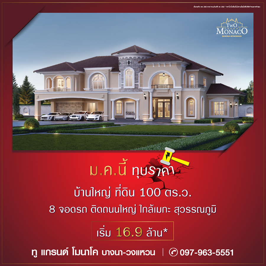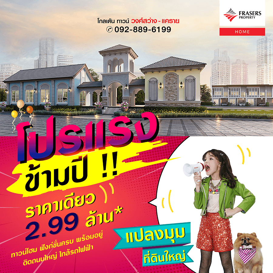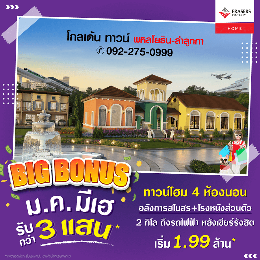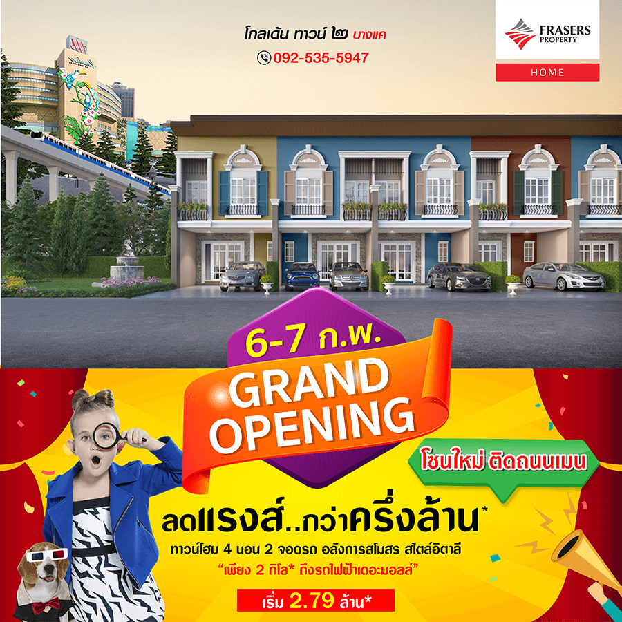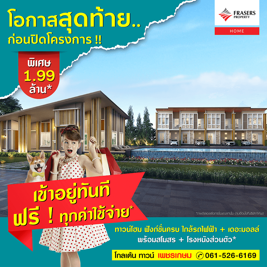 Promotion : 16-17 ม.ค. นี้ รับโบนัสก้อนโต ไม่ต้องผ่อนนาน 24 เดือน* ทาวน์โฮม 4 ห้องนอน 3 ห้องน้ำพร้อมห้องพระ + โรงหนังส่วนตัว*อลังการสโมสรสไตล์อังกฤษ บนทำเลศักยภาพ ใกล้ห้างฯ + ทางด่วน + รถไฟฟ้า* เริ่ม 2.65 ล้าน*