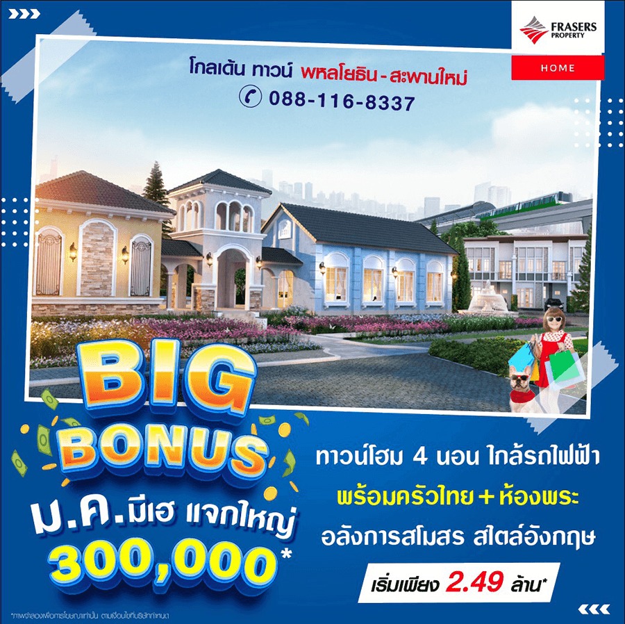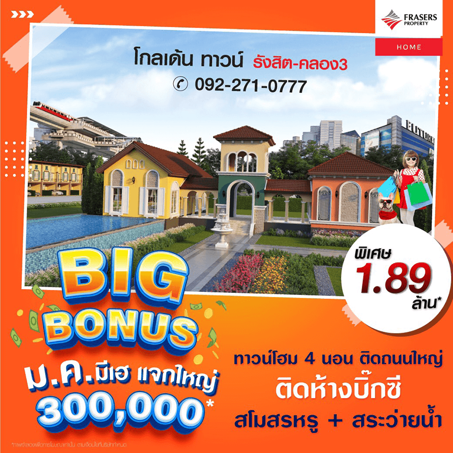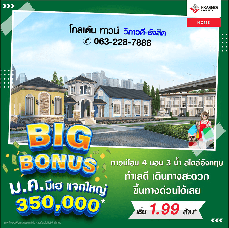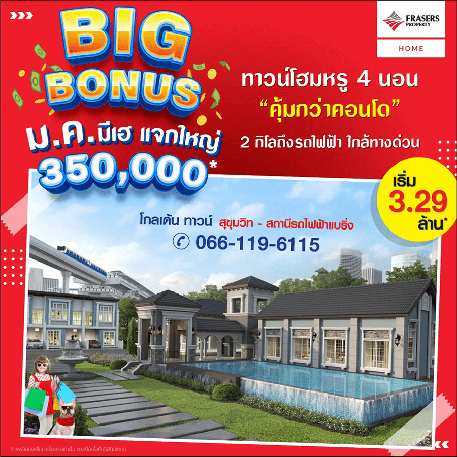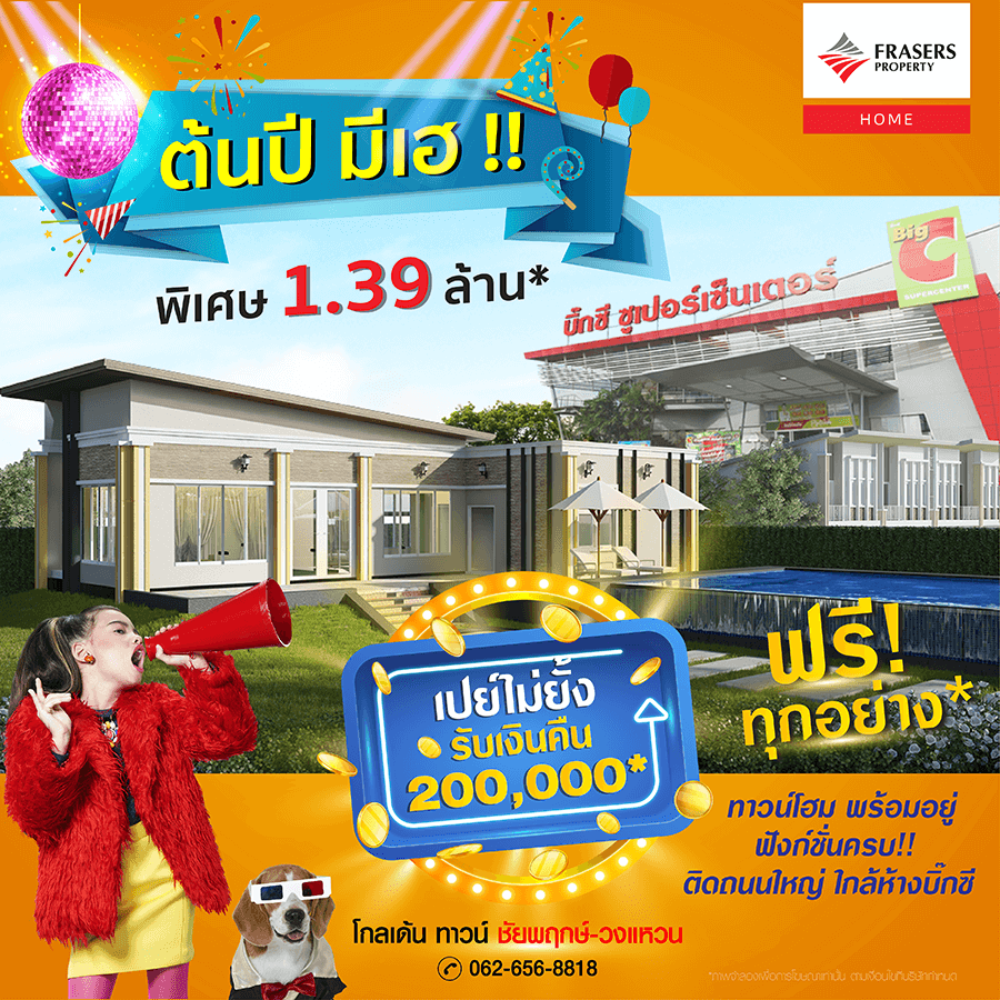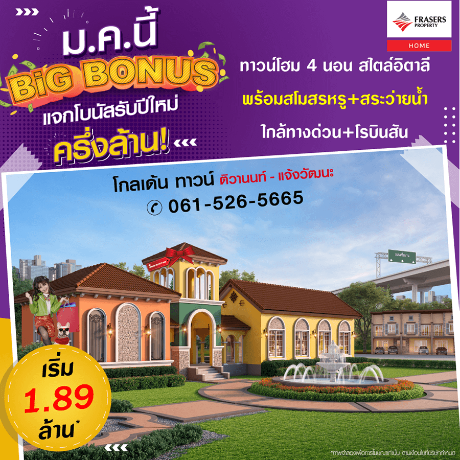 Promotion : BIG BONUS ม.ค.นี้ มีเฮ แจกใหญ่ กว่า 300,000* ห้ามพลาด ราคาสุดพิเศษเพียง 1.89 ล้าน* ทาวน์โฮม 4 ห้องนอน ฟังก์ชั่นครบครัน พร้อมสโมสรหรู + สระว่ายน้ำ ทำเลคุณภาพ ติดถนนใหญ่+ห้างบิ๊กซี