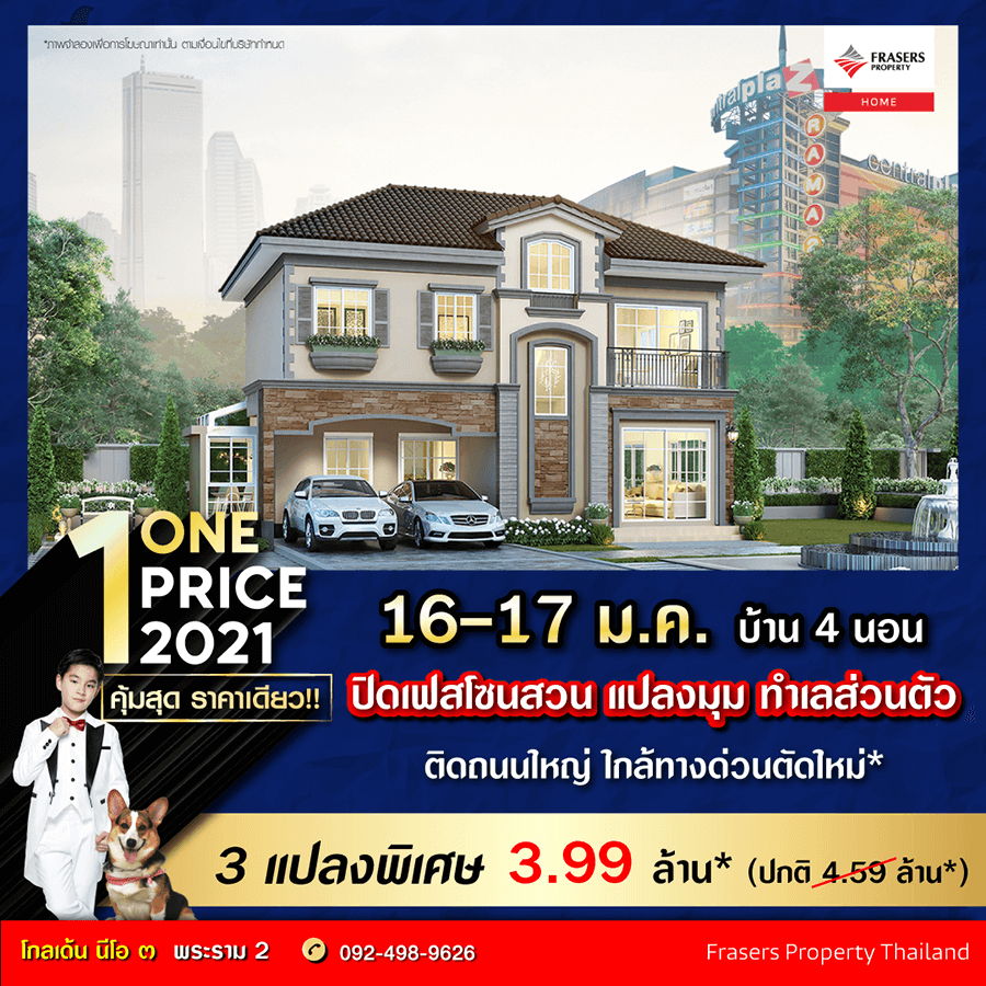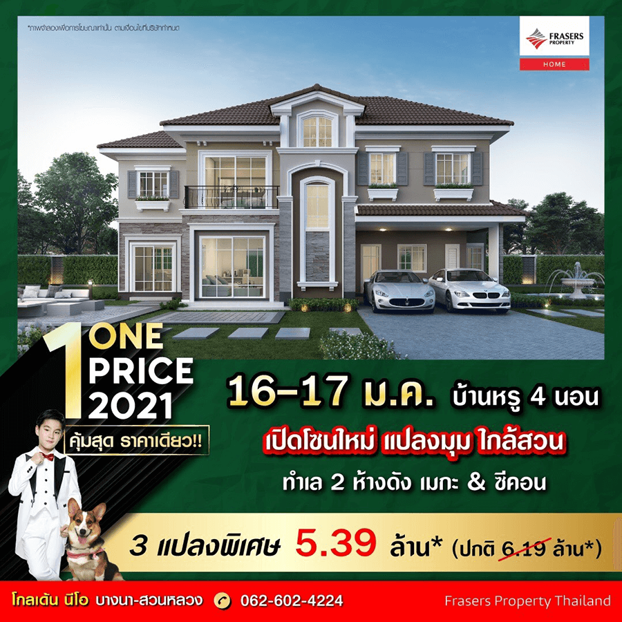 Promotion : 16 - 17 ม.ค. นี้ คุ้มที่สุด ราคาเดียว ONE PRICE 2021 พบ 3 แปลงพิเศษ จัดให้ต้อนรับปีใหม่ ราคา 5.39 ล้าน* (ปกติ 6.19 ล้าน*) เปิดโซนใหม่ แปลงมุม ใกล้สวน บ้านหรู 4 นอน ครบครัน ทุกการใช้งาน ทำเลศักยภาพ 2 ห้างดัง เมกะ & ซีคอน