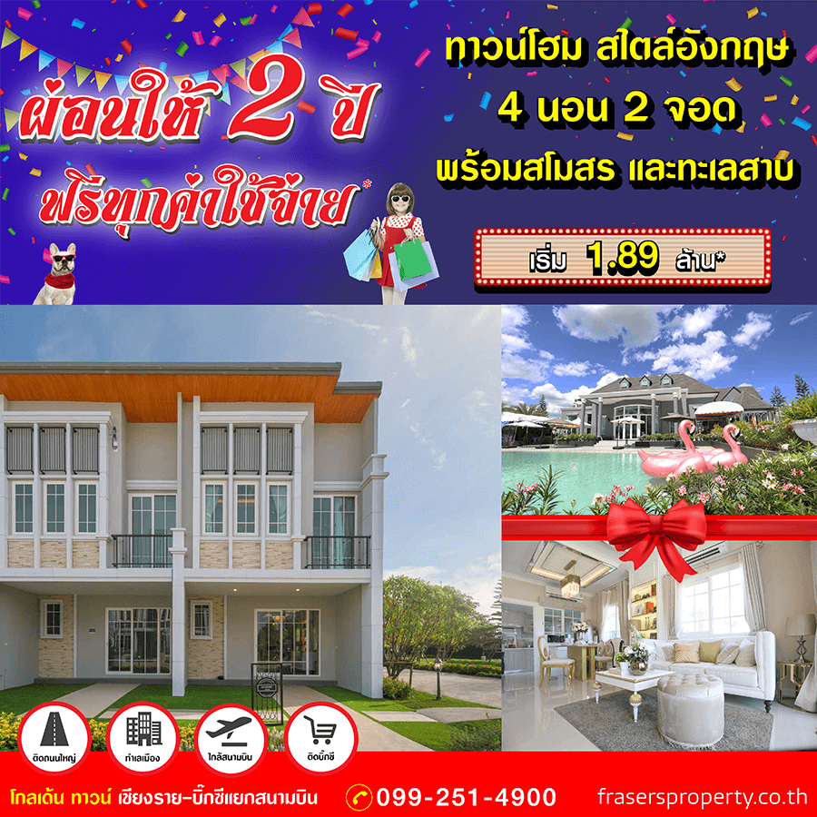 Promotion : วันที่ 1-31 ม.ค. 64 ปีใหม่ บ้านใหม่ ชาวเชียงรายเตรียมฉลอง รับโปรจัดหนัก! ผ่อนให้ 2 ปี ฟรีทุกค่าใช้จ่าย ทาวน์โฮม สไตล์อังกฤษ 4 นอน 2 จอด ส่วนกลางอลังการที่สุดในเชียงราย พร้อมสโมสร และ ทะเลสาบ บนทำเลคุณภาพ ติดบิ๊กซีแยกสนามบิน เริ่ม 1.89 ล้าน*