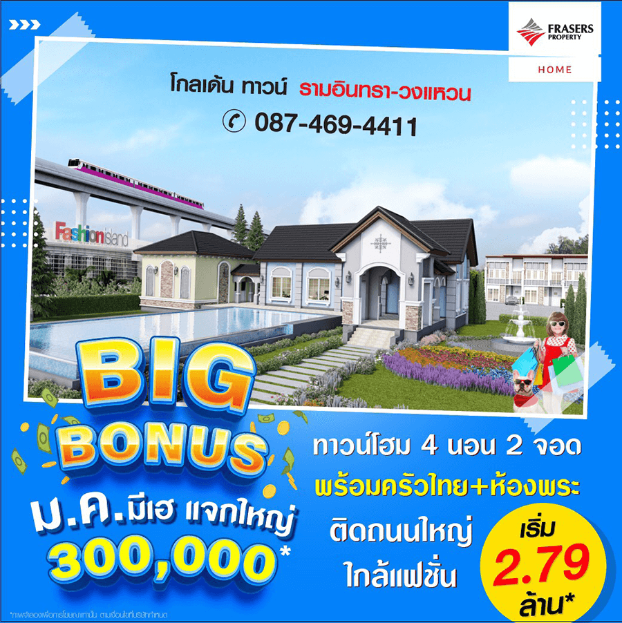 Promotion : วันที่ 1-31 ม.ค. 64 BIG BONUS ม.ค.นี้ มีเฮ แจกหนักแจกใหญ่ กว่า 300,000* พลาดไม่ได้ทาวน์โฮมหรู 4 นอน 2 จอด ย่านรามอินทรา ฟังก์ชั่นครบครัน พร้อมครัวไทย+ห้องพระ อลังการสโมสร สไตล์อังกฤษ สุดยอดทำเล ติดถนนใหญ่ ใกล้แฟชั่นฯ พิเศษเพียง 2.79 ล้าน*