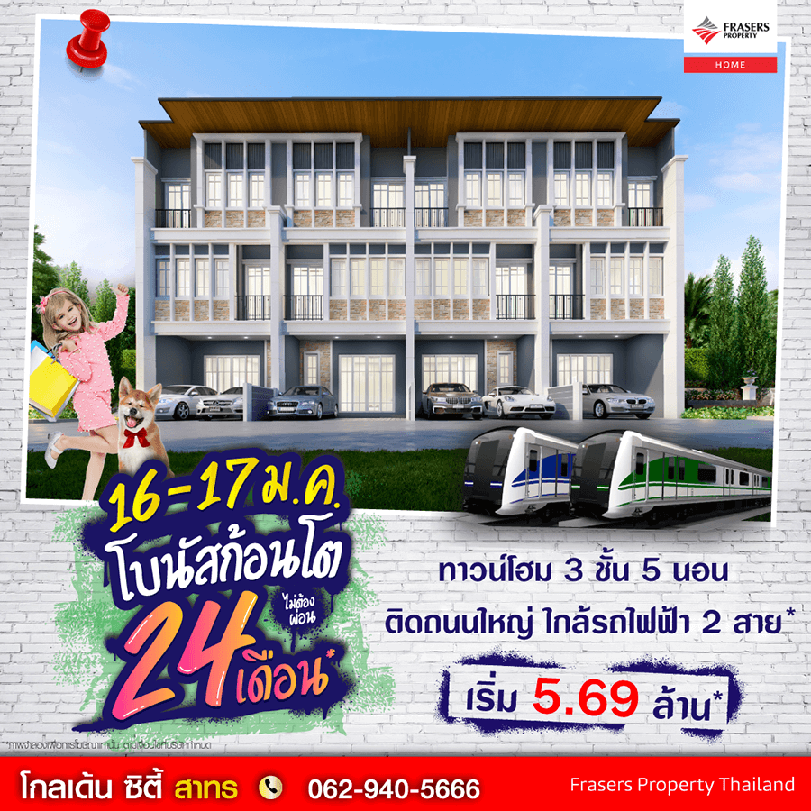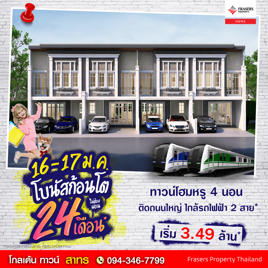 Promotion : 16-17 ม.ค. นี้ รับโบนัสก้อนโต ไม่ต้องผ่อนนาน 24 เดือน* ทาวน์โฮม 4 ห้องนอน 2 ที่จอดรถ ฟังก์ชั่นครบครัน ห้องพระ + ครัวไทย* พร้อมคลับเฮาส์หรู สไตล์อังกฤษ ติดถนนใหญ่ ใกล้รถไฟฟ้า " เพียง 5 สถานีถึงสาทร " เริ่ม 3.49 ล้าน*