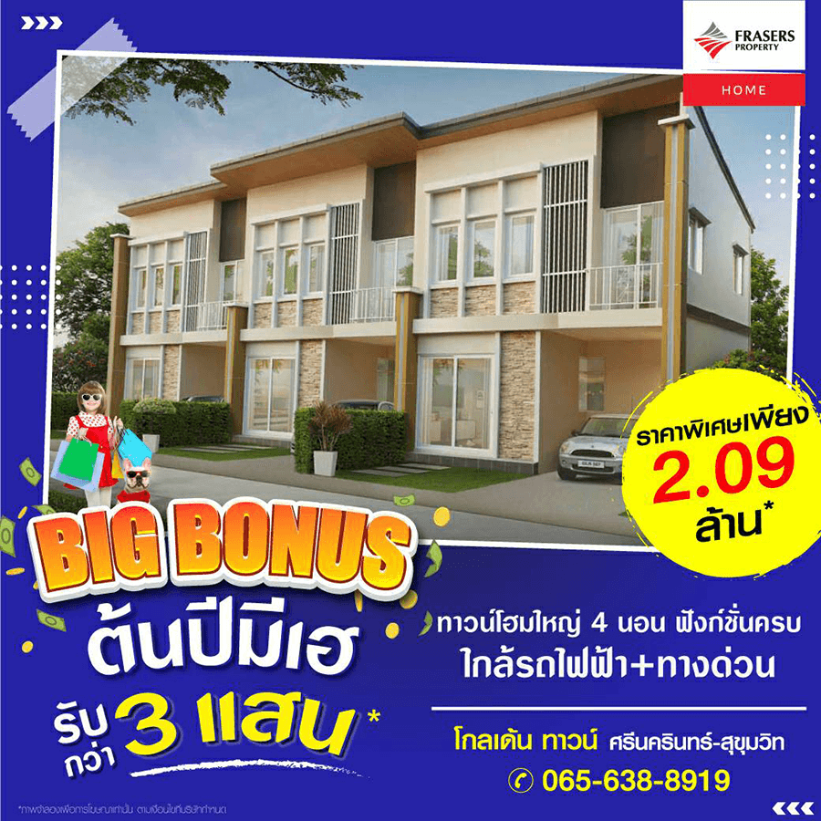 Promotion : BIG BONUS ม.ค.นี้ มีเฮ จัดโปรสุดพิเศษ รับสูงสุดกว่า 4 แสน* คุ้มสุดคุ้ม ราคาเริ่มเพียง 1.99 ล้าน* ทาวน์โฮมหรู 4 ห้องนอน 2 ที่จอดรถ ฟังก์ชั่นครบครัน ทำเลคุณภาพ ย่านศรีนครินทร์-สุขุมวิท เดินทางสะดวก ใกล้ทางด่วน และรถไฟฟ้า