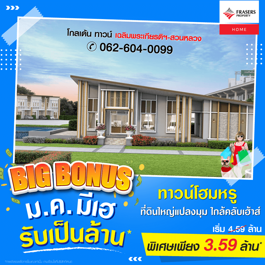 Promotion : วันที่ 1-31 ม.ค. 64 BIG BONUS ม.ค.นี้ มีเฮ โปรจัดหนัก รับเป็นล้าน* ห้ามพลาด แปลงพิเศษที่ดินใหญ่แปลงมุม! ใกล้คลับเฮ้าส์ ราคาสุดพิเศษเพียง 3.59 ล้าน* ทาวน์โฮมหรู 4 ห้องนอน 2 จอดรถ ฟังก์ชั่นครบครัน ครัวไทย + ห้องพระ สโมสรหรู ตอบโจทย์ทุกไลฟ์สไตล์ ทำเลคุณภาพ ใกล้สวนหลวง + เมกาบางนา