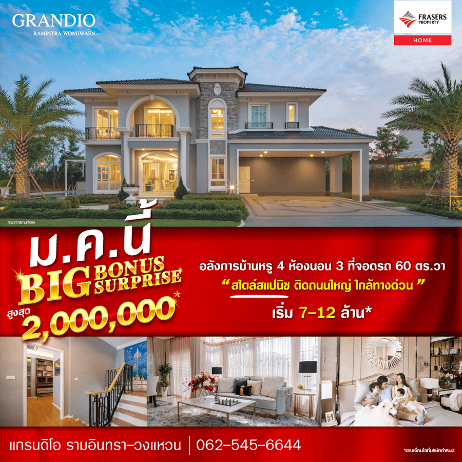 Promotion : ม.ค.นี้ BIG BONUS BIG SURPRISE พบกับของขวัญพิเศษ ให้สูงสุดกว่า 2,000,000* อลังการบ้านหรู 4 ห้องนอน 3 ที่จอดรถ 60 ตร.วา สไตล์สแปนิช แห่งเดียวย่านรามอินทรา บนทำเลทอง ติดถนนใหญ่ ใกล้ทางด่วน คุณค่าที่คุณคู่ควร บนอาณาจักรใหม่ Grandio De Espana เริ่ม 7-12 ล้าน*
