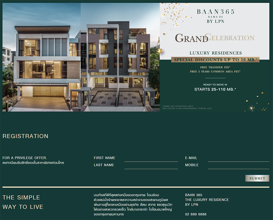 BAAN 365 RAMA III BY LPN เฉลิมฉลองครั้งใหญ่ต้อนรับปีฉลู เดินหน้าจัดแคมเปญ GRAND CELEBRATION มอบราคาสุด EXCLUSIVE ลดสูงสุดถึง 10 ล้านบาท ให้กับลูกค้า พร้อมฟรีค่าธรรมเนียมการโอน และฟรีค่าส่วนกลาง 2 ปี (เงื่อนไขเป็นไปตามที่บริษัทกำหนด)