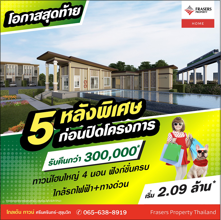 Promotion : วันนี้- 28 กุมภาพันธ์นี้เท่านั้น โอกาสสุดท้าย 5 หลังพิเศษก่อนปิดโครงการ โกลเด้น ทาวน์ สุขุมวิท-สถานีรถไฟฟ้าแบริ่ง รับคืนกว่าครึ่งล้าน* #คุ้มยิ่งกว่าคุ้ม ทาวน์โฮมหรู สไตล์อังกฤษ 4 ห้องนอน 2 จอดรถ เพียง 2 กิโลเมตรถึงรถไฟฟ้า ใกล้ทางด่วน พร้อมสโมสรสุดอลังการ ตอบโจทย์ทุกไลฟ์สไตล์ เริ่ม 3 ล้านต้น*