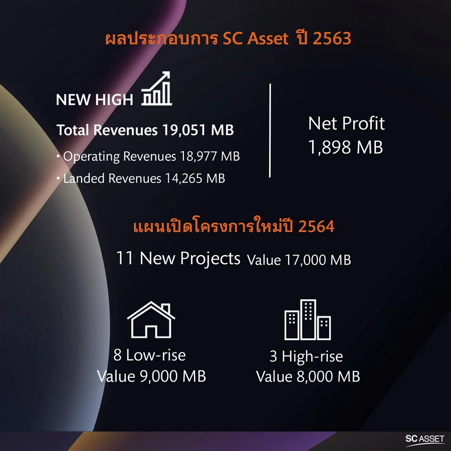 นายอรรถพล กล่าวสรุปว่า "ด้วยความเชื่อมั่นของลูกค้าและพันธมิตรทางธุรกิจ ประกอบกับความพร้อมในทุกด้านของ SC มั่นใจว่า ปี 2564 บริษัทจะประสบความสำเร็จเติบโตทั้งยอดขายและรายได้เช่นที่ผ่านมา โดยมาจากทั้งพอร์ตหลักของแนวราบทุกระดับราคา จำนวน 58 โครงการ มูลค่าโครงการ 36,900 ล้านบาท และโครงการแนวสูง 11 โครงการ มูลค่าโครงการ 20,600 ล้านบาท"