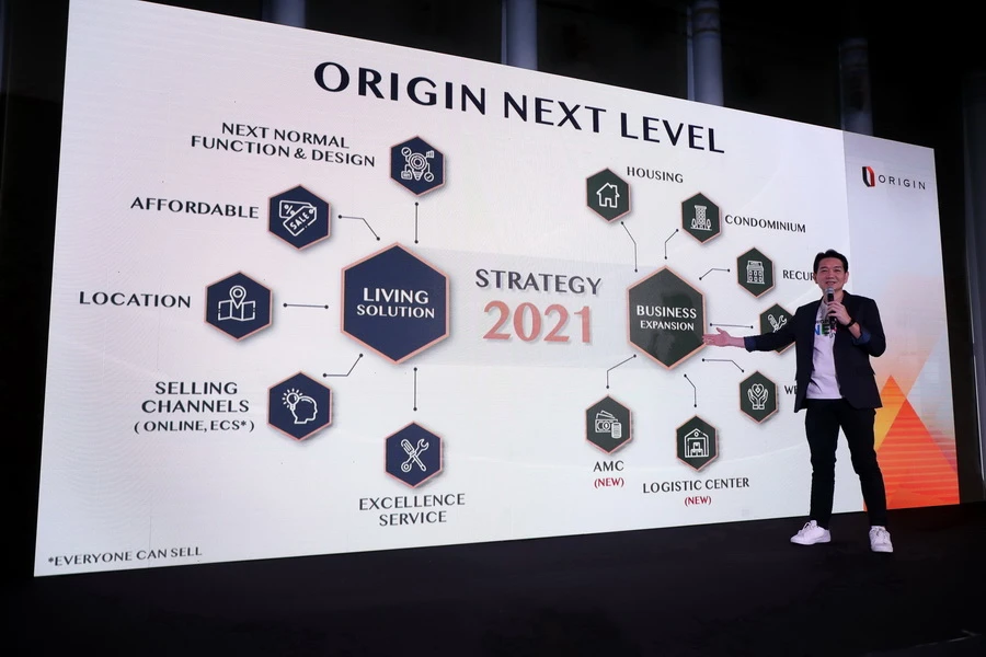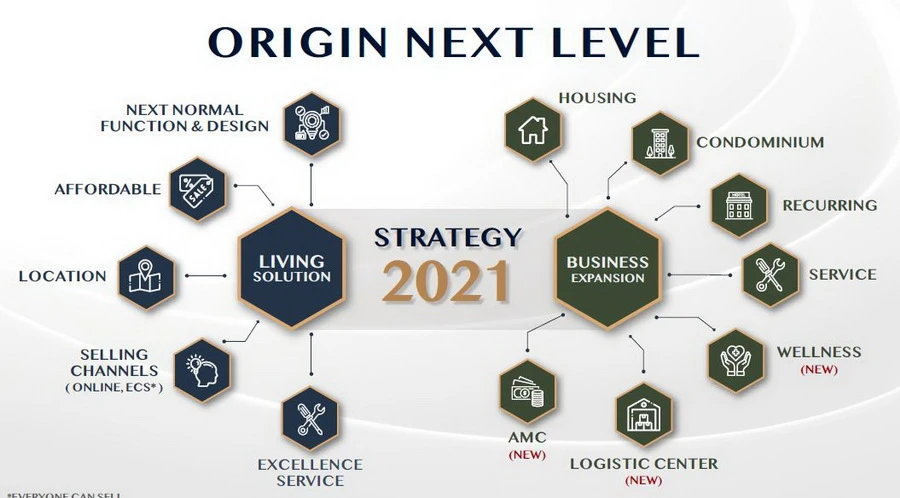 ในปี 2564 นี้ บริษัทจึงจะเดินหน้าเติบโตแบบ Next Level สอดรับกับวิสัยทัศน์ของออริจิ้น พร็อพเพอร์ตี้ เปิดตัวโครงการใหม่ 11 โครงการ มูลค่ารวมกว่า 10,400 ล้านบาท หรือสูงติดระดับท็อปของผู้พัฒนาอสังหาริมทรัพย์กลุ่มแนวราบในปีนี้ ตอกย้ำความแข็งแกร่งที่เติบโตอย่างต่อเนื่องนับตั้งแต่ก่อตั้งบริษัท และการขยายตลาดในปีนี้ มุ่งเน้นการเติบโตในทำเลใหม่ๆ โดยเฉพาะในฝั่งตะวันตกของกรุงเทพฯที่ยังมีดีมานด์สูง เพื่อเป็นรากฐานสู่การเปิดโครงการสะสมจนครอบคลุม 10 จังหวัดในปี 2565 ขณะเดียวกัน บริษัทยังได้ปรับเปลี่ยนโลโก้ใหม่ เพื่อแสดงตัวตนและสื่อถึงความเป็นผู้ประกอบการที่มีการปรับตัวให้ทันสมัยต่อสถานการณ์ในยุคนี้