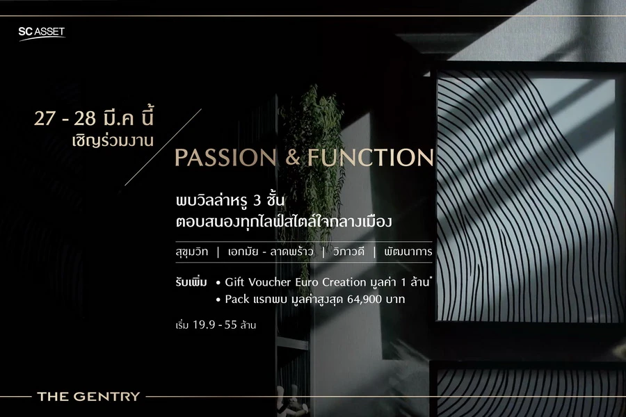 บริษัท เอสซี แอสเสท คอร์ปอเรชั่น จำกัด (มหาชน) ผู้นำด้านพัฒนาอสังหาริมทรัพย์ชั้นนำ จัดแคมเปญพิเศษ Passion & Function พบ เดอะ เจนทริ วิลล่าหรู 3 ชั้น บน 4 ทำเลศักยภาพ ด้วยพื้นที่ใช้สอยขนาดใหญ่เริ่มต้น 372 ตารางเมตร ตอบสนองทุกไลฟ์สไตล์การใช้ชีวิตใจกลางเมือง ได้แก่