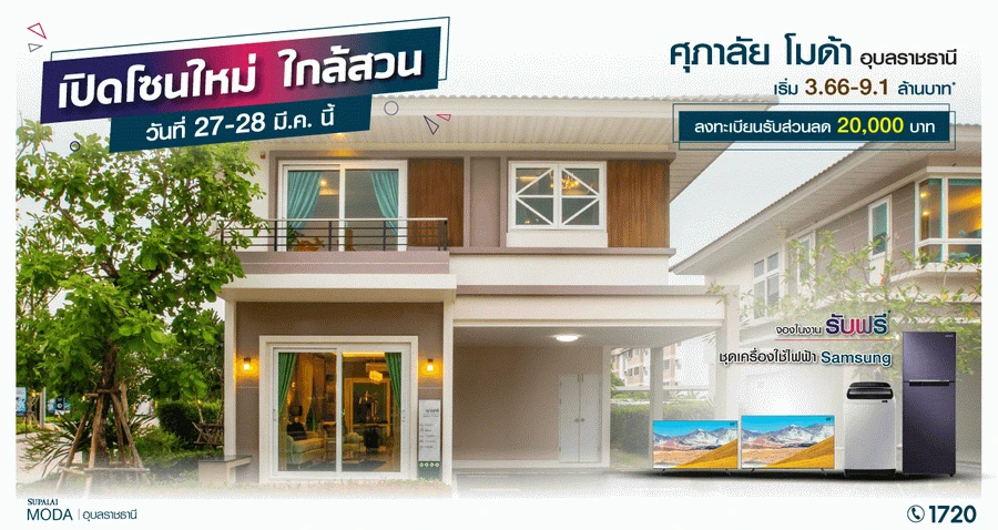 ศุภาลัย โมด้า อุบลราชธานี เปิดโซนใหม่ ใกล้สวน วันที่ 27 - 28 มีนาคม 2564 นี้ เริ่ม 3.66 - 9.1 ล้านบาท ลงทะเบียนรับส่วนลด 20,000 บาท จองในงาน รับฟรี ชุดเครื่องใช้ไฟฟ้า Samsung