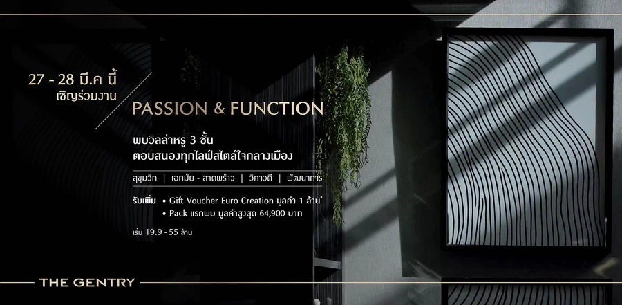 27 - 28 มีนาคม 2564 นี้ พบประสบการณ์การพักผ่อน พร้อมมอบความสงบ แม้จะอยู่ใจกลางเมืองที่วุ่นวายไม่เคยหลับ เดอะ เจนทริ วิลล่าหรู 3 ชั้น บน 4 ทำเลศักยภาพ สุขุมวิท | เอกมัย-ลาดพร้าว | วิภาวดี | พัฒนาการ รับเพิ่มข้อเสนอสุดพิเศษภายในงาน PASSION & FUNCTION GIFT VOUCHER EURO CREATION มูลค่า 1 ล้าน* และ PACK แรกพบ มูลค่าสูงสุด 64,900 บาท** เริ่ม 19.9 - 55 ล้านบาท