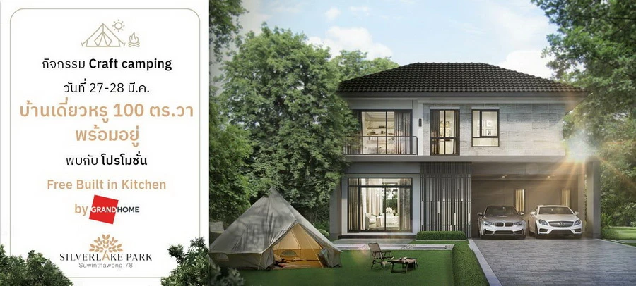มาร่วมสนุกกับกิจกรรมตั้งแคมป์ "Craft Camping" 27 - 28 มีนาคม 2564 นี้ ที่โครงการ ซิลเวอร์ เลค พาร์ค สุวินทวงศ์ 78 บ้านเดี่ยวหรู 100 ตร.วา พร้อมอยู่ ลงทะเบียนที่นี่ http://www.silverlake-park.com/ พร้อมโปรโมชั่น ฟรี! Built-in kitchen by GRANDHOME เริ่มเพียง 5.49 ล้านบาท พื้นที่บ้านกว้าง 100 ตร.วา อยู่สบาย มีครบทุกฟังก์ชัน มีส่วนกลางขนาดใหญ่และทะเลสาบ ให้กลิ่นอายราวกับ In The Midst Of Nature คุ้มค่าที่สุด พร้อมมอบคุณภาพชีวิตที่ดีในระยะยาว