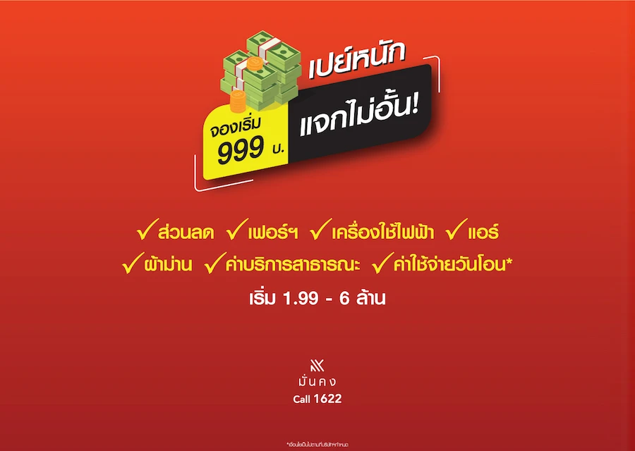 เปย์หนัก แจกไม่อั้น จองเริ่ม 999 บาท รับ ส่วนลด เฟอร์ เครื่องใช้ไฟฟ้า แอร์ ผ้าม่าน ค่าบริการสาธารณะ ค่าใช้จ่ายวันโอน เริ่ม 1.99 - 6 ล้านบาท