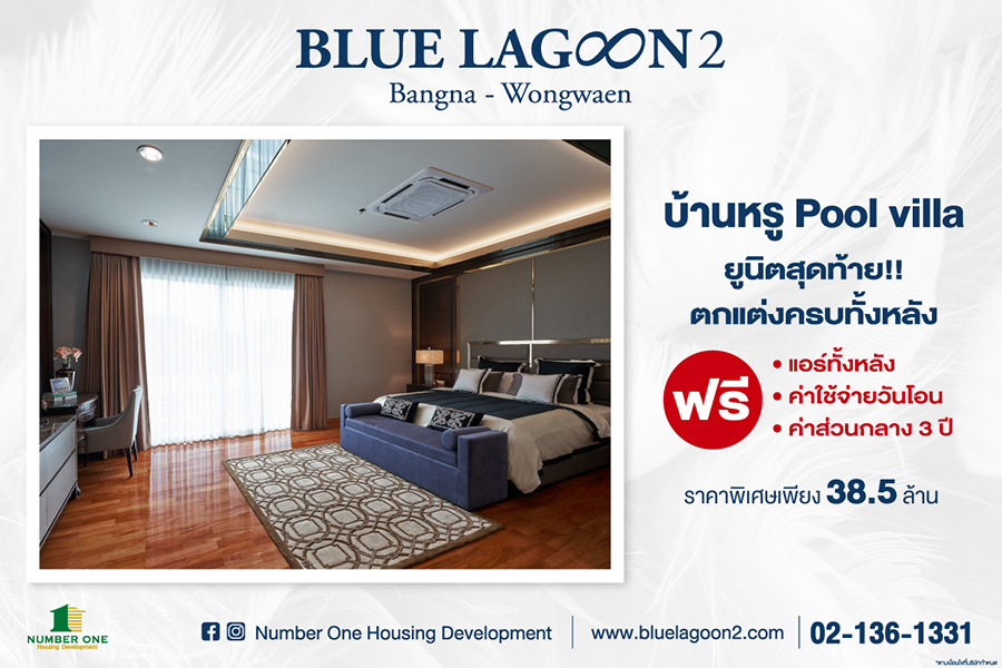 บริษัท นัมเบอร์วันเฮ้าส์ซิ่ง ดิเวลลอปเม้นท์ จำกัด ผู้พัฒนาอสังหาริมทรัพย์คุณภาพโครงการ บลูลากูน 2 บางนา - วงแหวน (Blue lagoon 2 Bangna - Wongwaen) เปิดจองบ้านหรูพูลวิลล่า ยูนิตสุดท้าย!! ตอบโจทย์ครอบครัวขนาดใหญ่ที่ต้องการที่ดินใหญ่ พื้นที่ใช้สอยเยอะ ครบครันด้วยสิ่งอำนวยความสะดวก โอบล้อมด้วยสวนสวยขนาดใหญ่ 7 ไร่ ที่พร้อมเปิดรับอากาศบริสุทธิ์ได้ทุกวัน