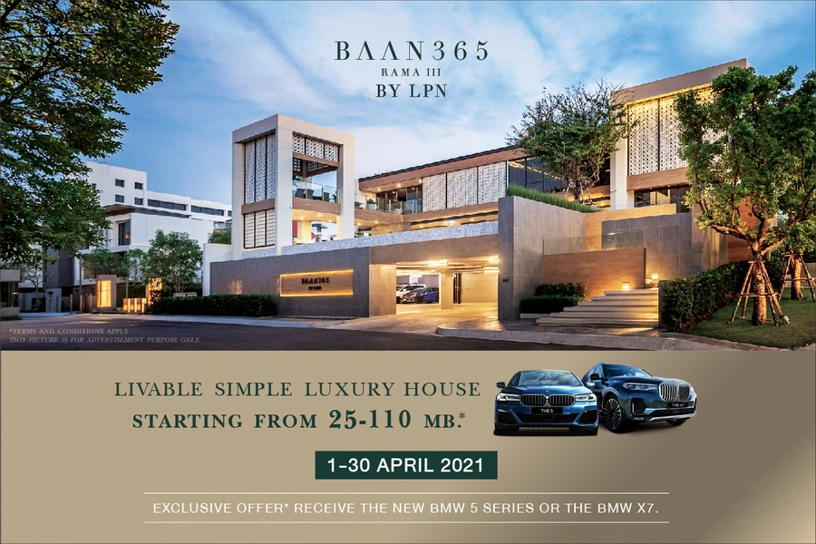 พบกับข้อเสนอสุดพิเศษให้กับผู้ที่จองซื้อบ้าน 365 พระราม 3 ภายในเดือนเมษายนนี้ ได้ร่วมสัมผัสและเป็นเจ้าของโครงการบ้านหรูพร้อมอยู่ ใจกลางเมือง จองบ้านวันนี้ พร้อมรับรถหรูป้ายแดง THE NEW BMW 5 SERIES หรือ THE BMW X7 มูลค่าสูงสุดกว่า 6 ล้านบาท* (เงื่อนไขเป็นไปตามที่บริษัทกำหนด) ตั้งแต่วันที่ 1 - 30 เมษายน 2564
