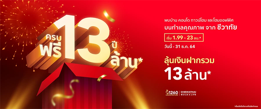 ชีวาทัย จัดแคมเปญฉลองครบรอบ 13 ปี กับโปรโมชั่น "ครบ 13 ปี ฟรี 13 ล้าน" ทั้งโครงการบ้าน คอนโด ทาวน์โฮม และโฮมออฟฟิศ บนทำเลคุณภาพ ราคาเริ่มต้น 1.99 - 23 ล้านบาท นอกจากนี้ยังได้ลุ้นรับโปรโมชั่น และของแถมเพิ่มเติม ทั้งลุ้นเงินฝากรวม 13 ล้านบาท* ลุ้นบัญชีเงินฝาก 1 ล้านบาท ทุกเดือน ตั้งแต่ มีนาคม - ธันวาคม 2564 และ Voucher Central มูลค่า 30,000 บาท เดือนละ 12 รางวัล อีกด้วย พบกันได้ตั้งแต่ วันนี้ - 31 ธันวาคม 2564
