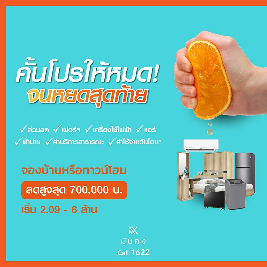 บริษัท มั่นคงเคหะการ จำกัด (มหาชน) หรือ MK บริษัทผู้พัฒนาอสังหาริมทรัพย์ เพื่อการขาย เพื่อเช่า และเพื่อการบริการ โหมโปรโมชั่นแบบฟูลออพชั่นกับ "คั้นโปรให้หมด! จนหยดสุดท้าย" ที่ให้ทั้งส่วนลดสูงสุดถึง 7 แสนบาท เมื่อจองบ้านหรือทาวน์โฮมในราคาเริ่มต้น 2.09 - 6 ล้านบาท พร้อมรับฟรีเฟอร์นิเจอร์ เครื่องใช้ไฟฟ้า แอร์ ผ้าม่าน และฟรีค่าใช้จ่ายวันโอน* ตั้งแต่วันนี้ - 31 พฤษภาคม นี้ เท่านั้น!