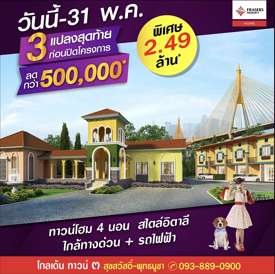 Promotion : วันนี้ - 31 พ.ค. นี้ 3 แปลงสุดท้ายก่อนปิดโครงการ ลดกว่า 500,000* ทาวน์โฮม 4 นอน สไตล์อิตาลี คุ้มสุดในย่านสุขสวัสดิ์ + พระราม3 พร้อมฟังก์ชันครบครัน ตอบโจทย์ทุกไลฟ์สไตล์ ทำเลคุณภาพ ใกล้ทางด่วน + รถไฟฟ้า ราคาพิเศษ 2.49 ล้าน*