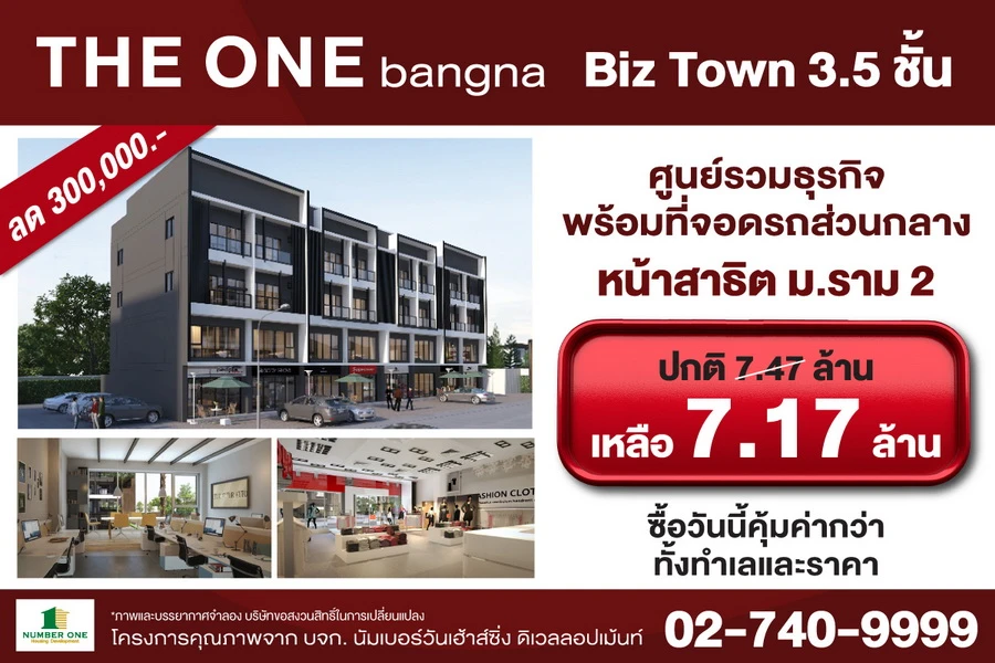 นัมเบอร์วันเฮ้าส์ซิ่ง ดิเวลลอปเม้นท์ เปิดจอง THE ONE bangna Biz town 3.5 ชั้น ศูนย์รวมธุรกิจ พร้อมที่จอดรถส่วนกลางจำนวนมาก เพื่อตอบโจทย์นักลงทุนที่กำลังมองหาทำเลศักยภาพย่านบางนา กับบิสทาวน์ ทำเลหน้าสาธิตมหาวิทยาลัยรามคำแหง2 ที่พร้อมทำธุรกิจและอยู่อาศัย ราคาเริ่มต้นเพียง 7.17 ล้านบาท ซื้อวันนี้คุ้มค่ากว่า ทั้งทำเลและราคา