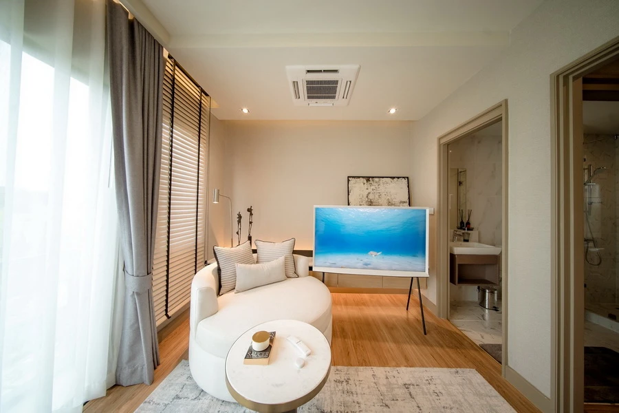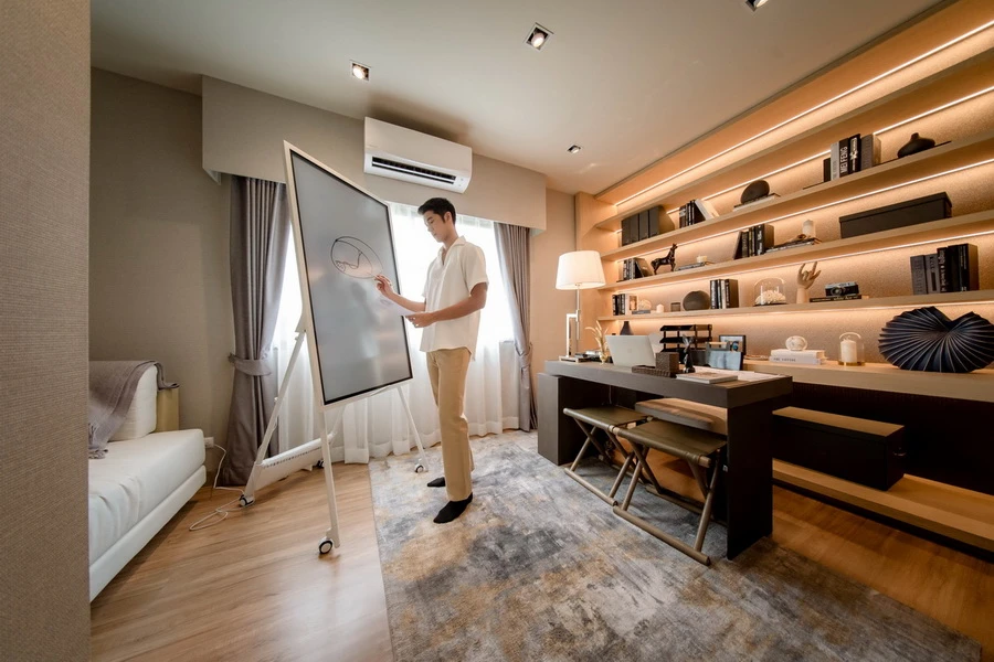 2. CREATIVE กระตุ้นความคิดสร้างสรรค์รองรับทุกการ Work from Home ด้วยพื้นที่อเนกประสงค์ในบ้านกลางเมืองที่สามารถปรับเปลี่ยนเป็นห้องประชุม สตูดิโอขนาดย่อม พร้อมนวัตกรรม Samsung Flip2 สมาร์ทบอร์ดอัจฉริยะ ปรับเปลี่ยนองศาได้ตามการใช้งานพร้อมเชื่อมต่อโลกออนไลน์ Smart Light แค่เปลี่ยนสีอารมณ์ก็เปลี่ยนกับเฉดสีมากกว่า 16 ล้านเฉดสี และไลฟ์สไตล์ทีวี The Serif สมาร์ททีวีระดับ 4K ที่สวยลงตัวในทุกมุมมอง ด้วยดีไซน์รูปทรงตัวอักษร "I" อันเป็นเอกลักษณ์ ที่มาพร้อมขาตั้งโลหะแบบพรีเมียมมินิมอล พร้อมยังให้ภาพสวยสมบูรณ์แบบ มีชีวิตชีวา สีสวยสด ด้วย เทคโนโลยี QLED