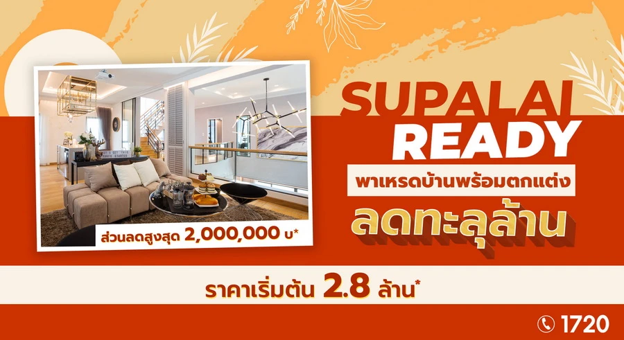 SUPALAI READY พาเหรดบ้านพร้อมตกแต่ง ลดทะลุล้าน มาพร้อมส่วนลดสูงสุด 2,000,000 บาท* เริ่มเพียง 2.8 ล้านบาท* ให้คุณได้เป็นเจ้าของ บ้านพร้อมตกแต่ง สวยมีระดับ โดยผู้เชี่ยวชาญด้านการออกแบบและตกแต่งภายใน สะดวก ง่าย ประหยัดเวลา ไม่เสียเวลาหาซื้อเฟอร์นิเจอร์ ยื่นกู้สินเชื่อเพื่อนำเงินมาตกแต่งบ้าน เพราะเรามีให้ พร้อมใช้อยู่อาศัยได้ทันที